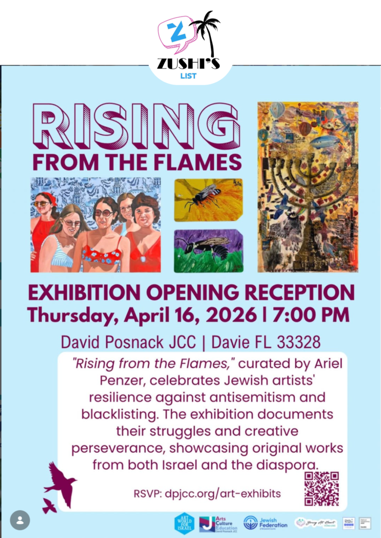 RISING FROM THE FLAMES EXHIBITION OPENING RECEPTION Thursday, April 16, 2026 | 7:00 PM David Posnack JCC | Davie FL 33328 “Rising from the Flames,” curated by Ariel Penzer, celebrates
