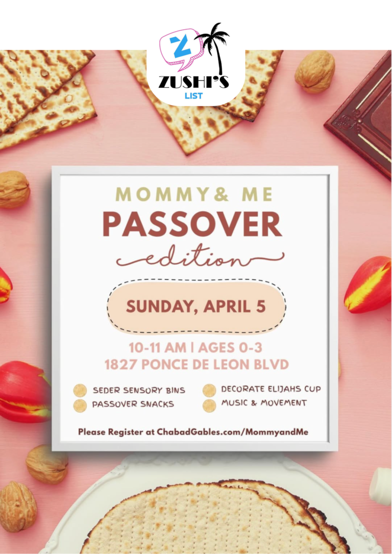 MOMMY& ME PASSOVER Edition Join us for Passover Mommy & Me Experience! Participate in hands -on activities including crunching Matzah, decorating Elijahs cup, circle time with the 10 Plagues, and