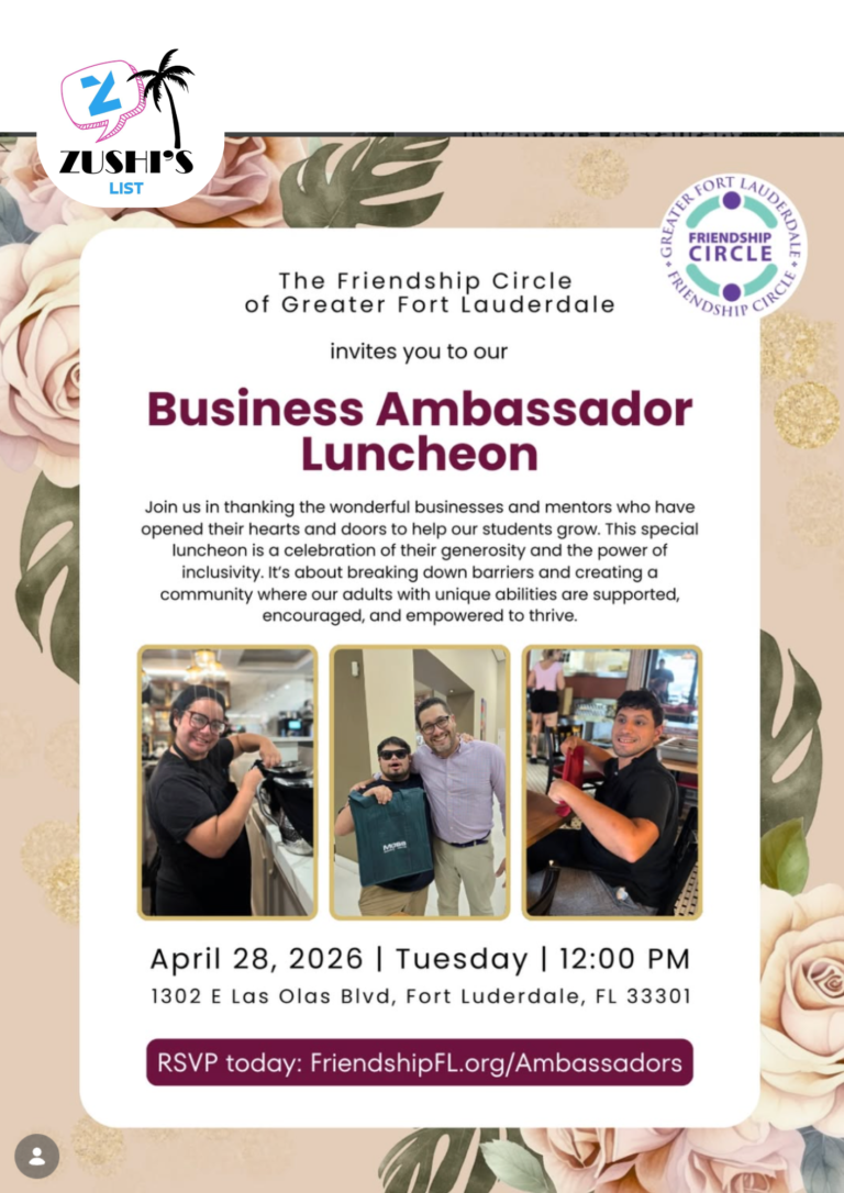 The Friendship Circle of Greater Fort Lauderdale invites you to our Business Ambassador Luncheon We’re celebrating the incredible businesses and mentors who help our adults with unique abilities feel seen,