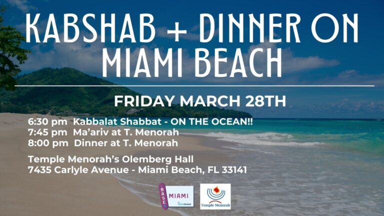 Sing and dance on the beach to greet the Sabbath Queen! Then shabbat dinner 📅 Friday March 27th ⏰ 6:30pm Kabbalat Shabbat on the beach | 7:45pm Ma’ariv | 8:00pm