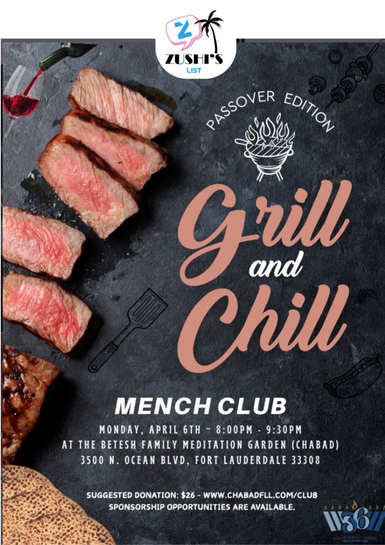𝐌𝐞𝐧𝐜𝐡 𝐂𝐥𝐮𝐛: 𝐆𝐫𝐢𝐥𝐥 & 𝐂𝐡𝐢𝐥𝐥 𝐬𝐩𝐞𝐜𝐢𝐚𝐥 “𝐏𝐚𝐬𝐬𝐨𝐯𝐞𝐫 𝐄𝐝𝐢𝐭𝐢𝐨𝐧” 𝐨𝐧 MONDAY 𝐀𝐩𝐫𝐢𝐥 6𝐭𝐡 𝐚𝐭 𝟖 𝐩𝐦! 🎉 AT THE BETESH FAMILY MEDITATION GARDEN (CHABAD) 3500N. OCEAN BLVD, FORT LAUDERDALE 33308 𝐄𝐧𝐣𝐨𝐲