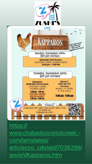 Join Chabad Coconut Creek and Miami for Kapparos on September 28 and 30, 2025. Prepay to reserve your chicken and participate in this meaningful tradition. Chickens will be donated to