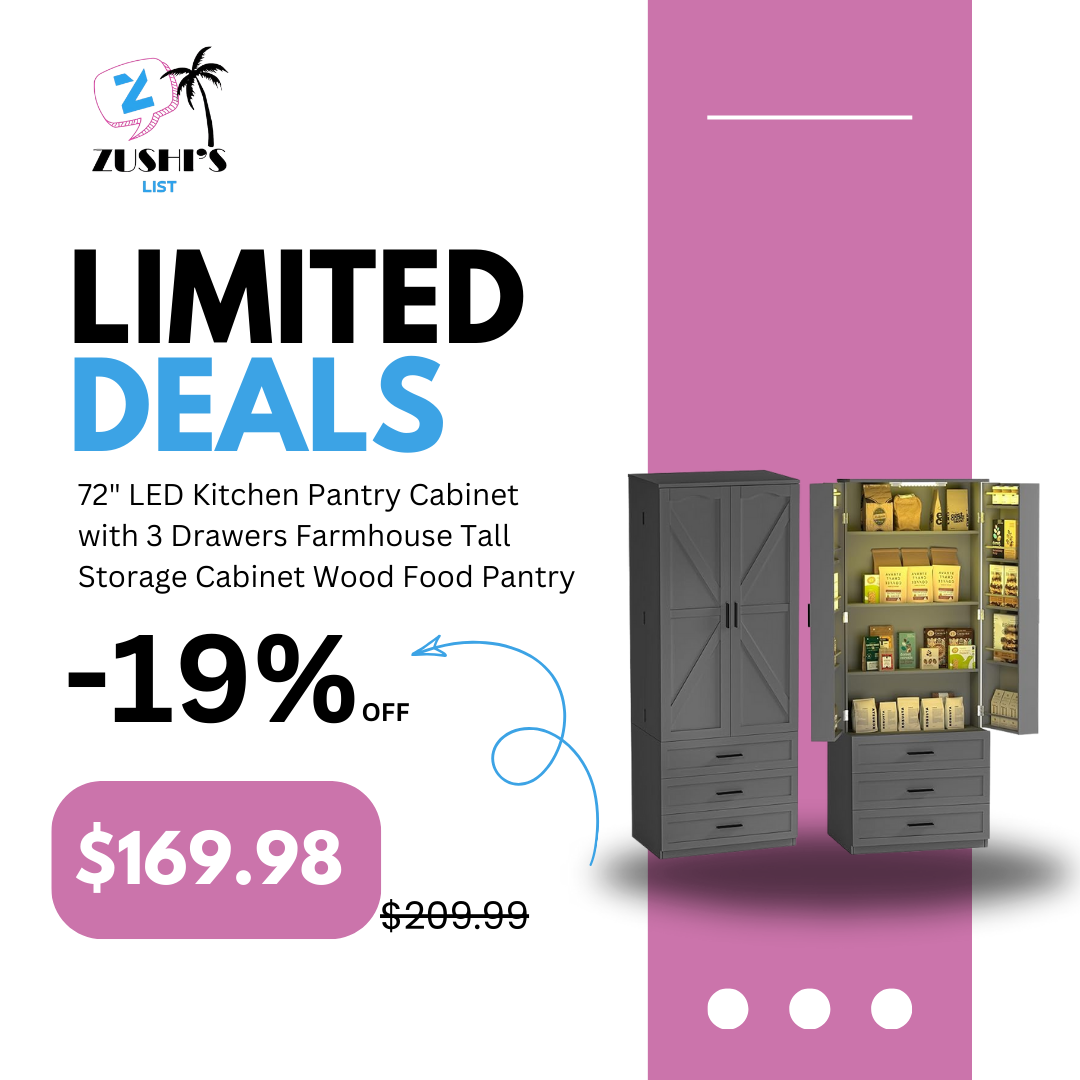 72″ LED Kitchen Pantry Cabinet with 3 Drawers Farmhouse Tall Storage Cabinet Wood Food Pantry with Barn Doors and Adjustable Shelves Versatile Storage Freestanding Cupboard for Kitchen