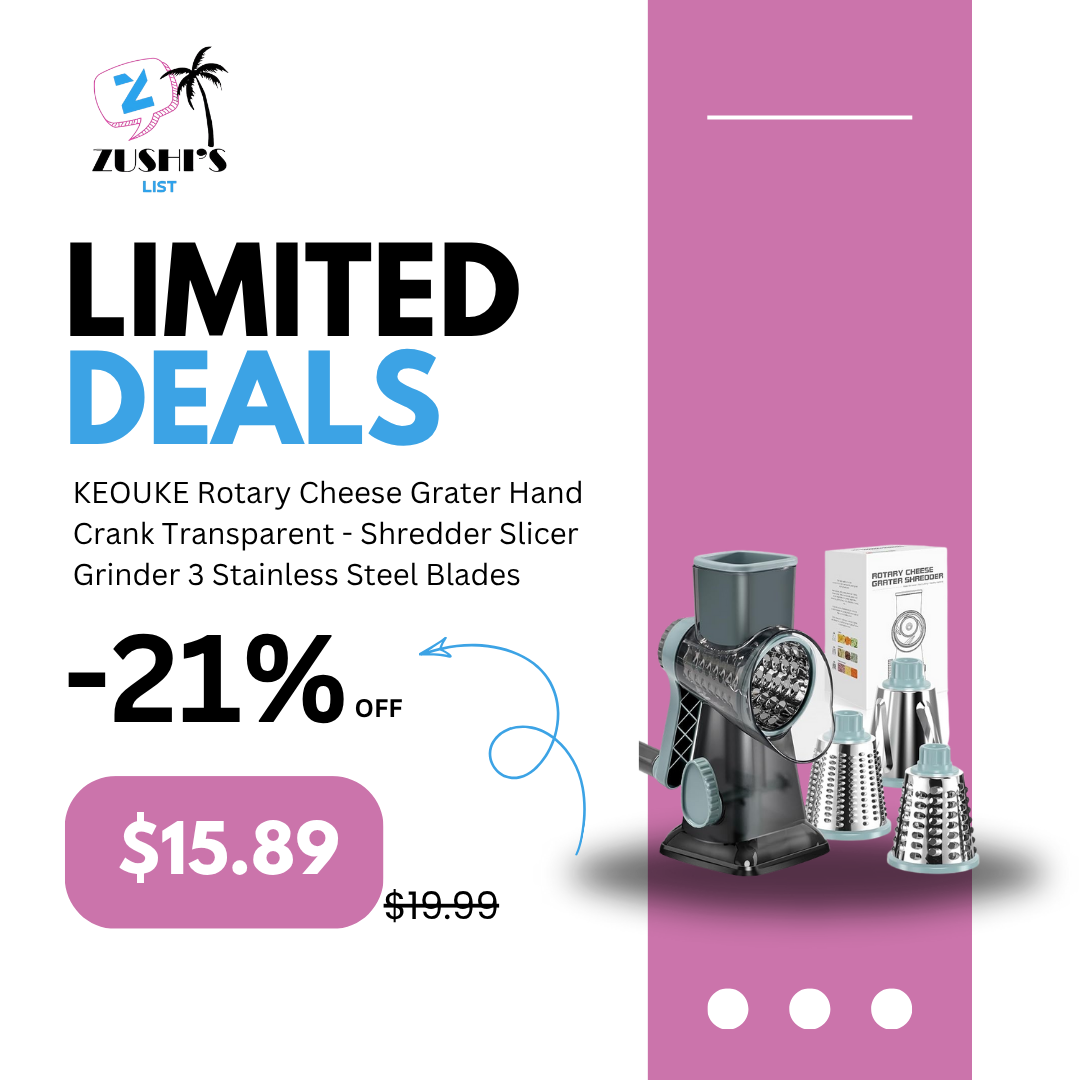 KEOUKE Rotary Cheese Grater Hand Crank Transparent – Shredder Slicer Grinder 3 Stainless Steel Blades, Stable Suction, Labor-Saving Handle, Safe Kitchen Tool for Cheese, Vegetable, Nuts, Chocolate