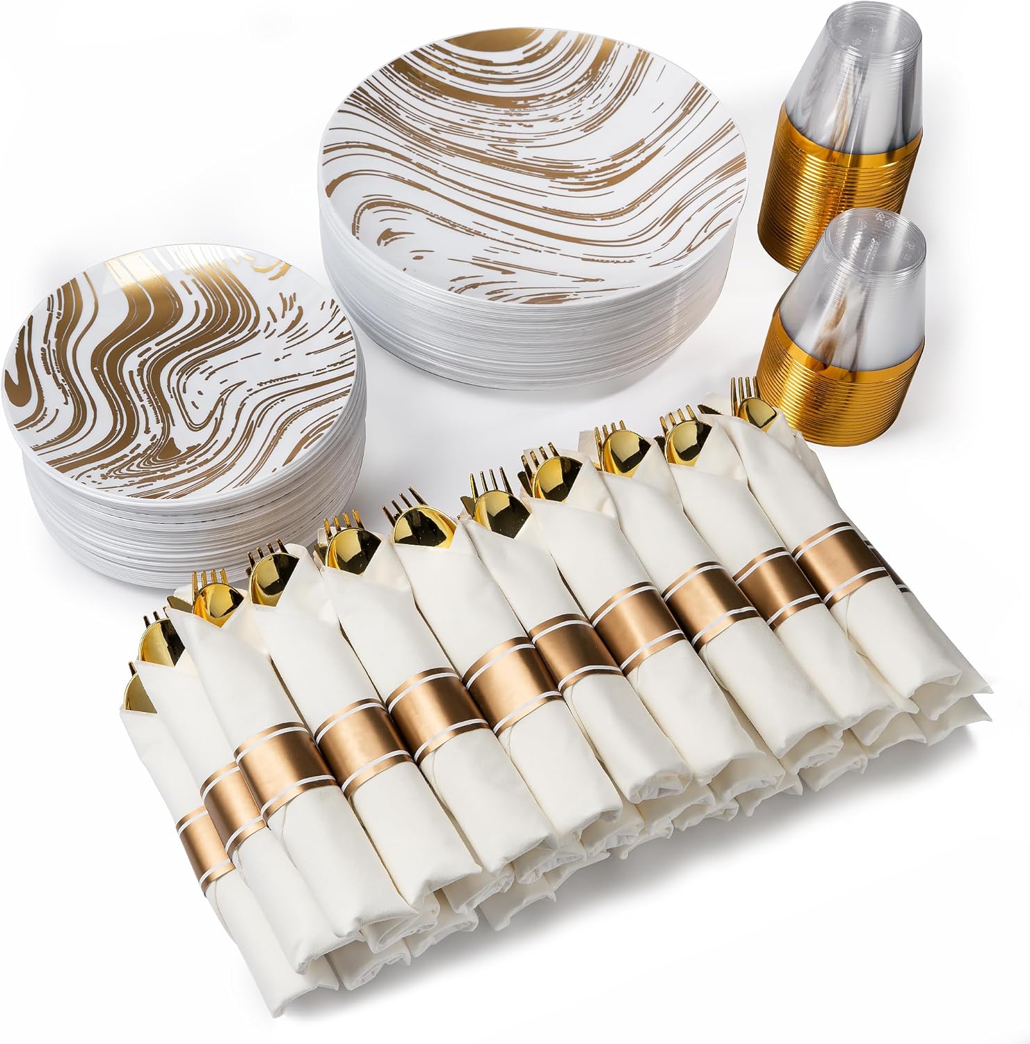 MONEST 350Pcs Gold Plastic Silverware Set for 50 Guests, Disposable Dinnerware Set includes: 50 Pre Rolled Napkins with Utensils, 50 Dinner Plates, 50 Dessert Plates, 50 Cups (Gold Wave)
