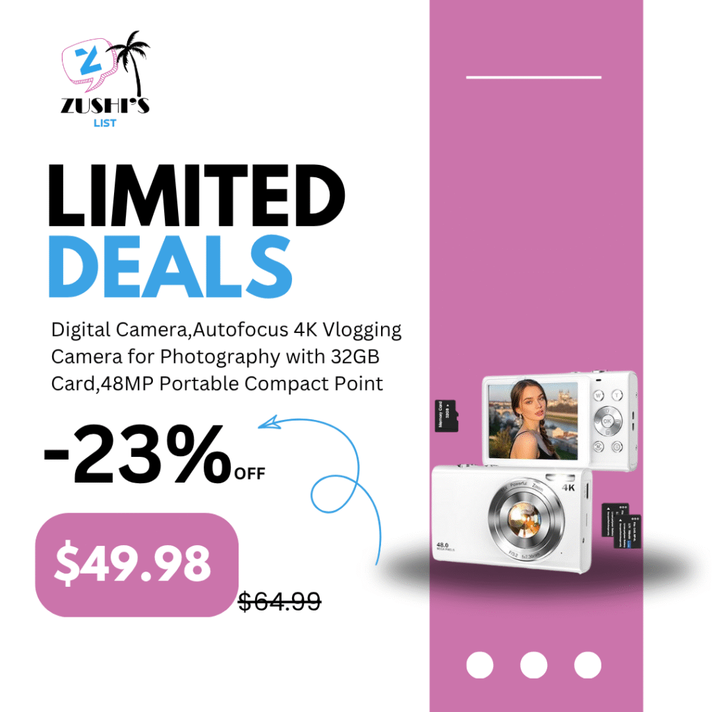 Digital Camera,Autofocus 4K Vlogging Camera for Photography with 32GB Card,48MP Portable Compact Point and Shoot Digital Camera for Teens Adult Beginner with 16X Zoom,Anti-Shake,2 Batteries(White)