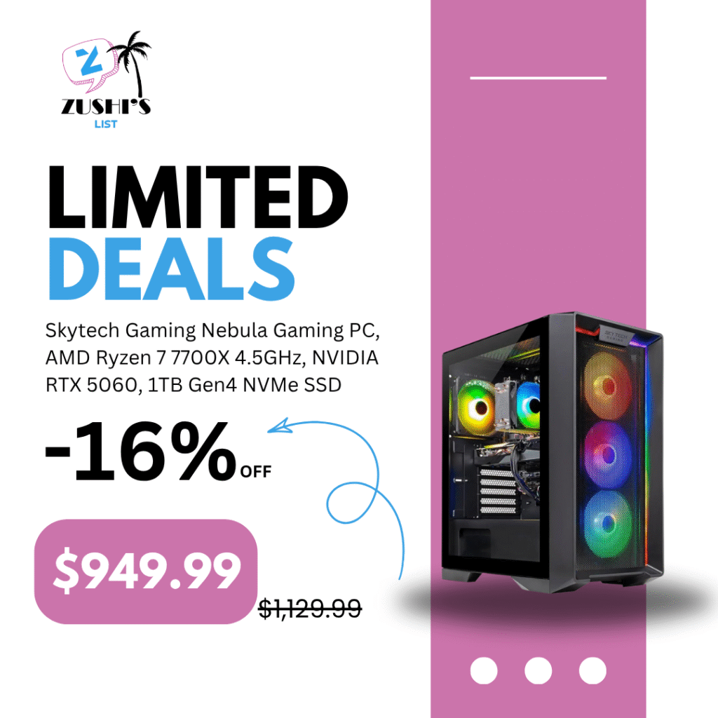 Skytech Gaming Nebula Gaming PC, AMD Ryzen 7 7700X 4.5GHz, NVIDIA RTX 5060, 1TB Gen4 NVMe SSD, 32GB DDR5 RAM 5600, 650W Gold PSU, Wi-Fi, Win 11, Desktop