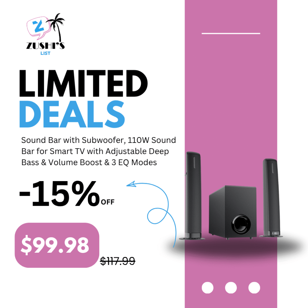 Sound Bar with Subwoofer, 110W Sound Bar for Smart TV with Adjustable Deep Bass & Volume Boost & 3 EQ Modes, Bluetooth/ARC/Opt/AUX, Detachable Soundbar for TV/PC/Gaming/Projector