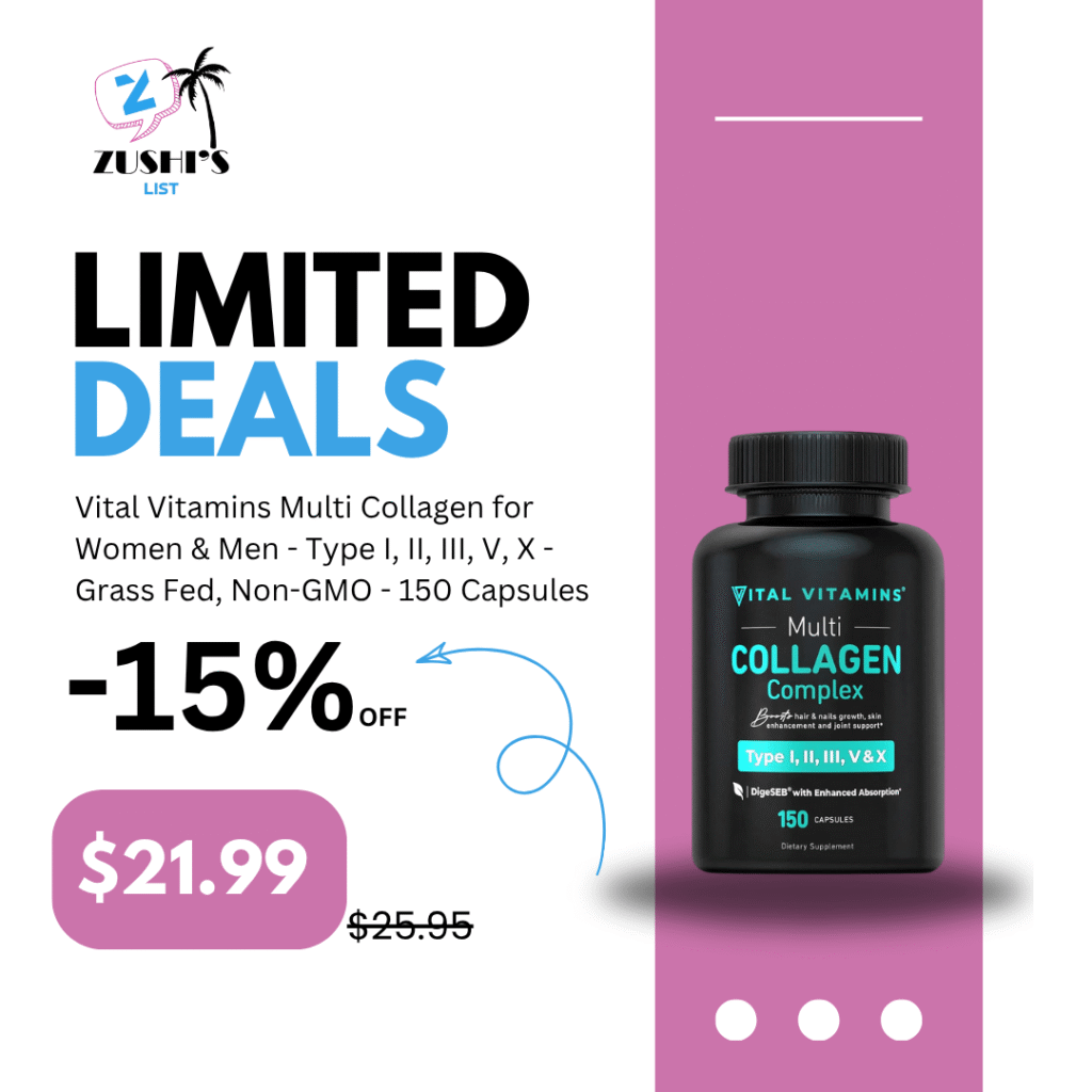 Vital Vitamins Multi Collagen for Women & Men – Type I, II, III, V, X – Grass Fed, Non-GMO – 150 Capsules