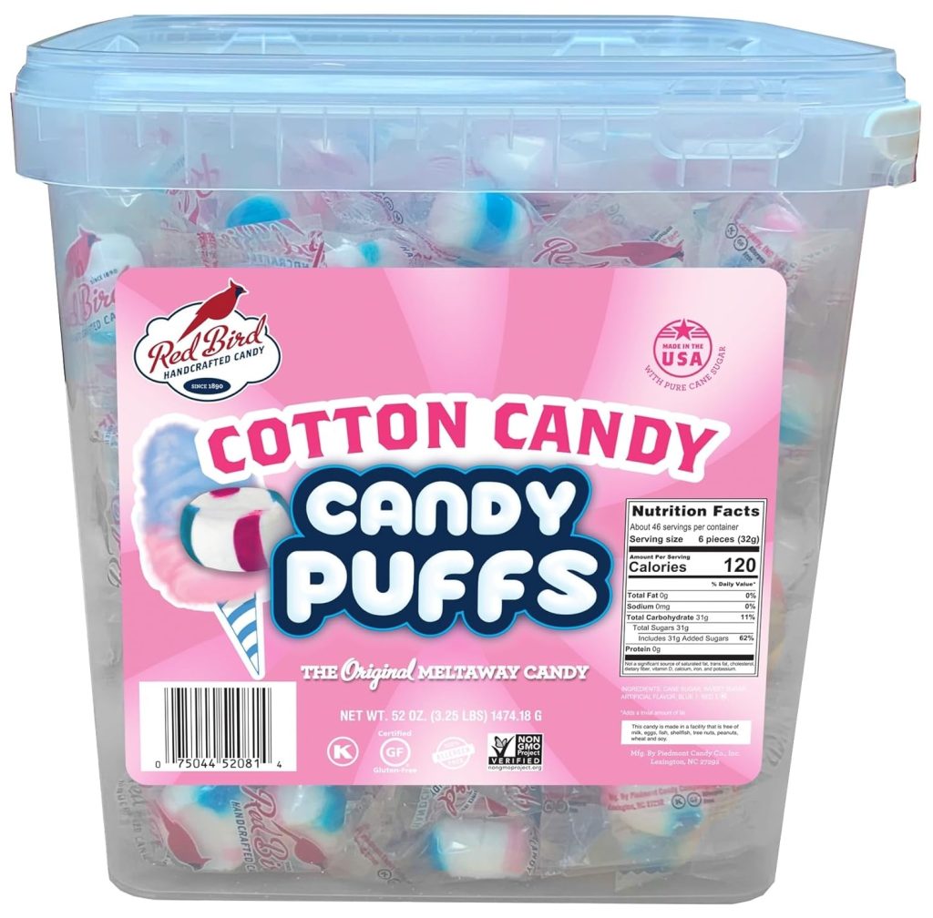 Red Bird Soft Cotton Candy Puffs 52 oz Tub, Mints Individually Wrapped, Gluten Free, Kosher, Free from Top 8 Allergens, Made with 100% Pure Cane Sugar