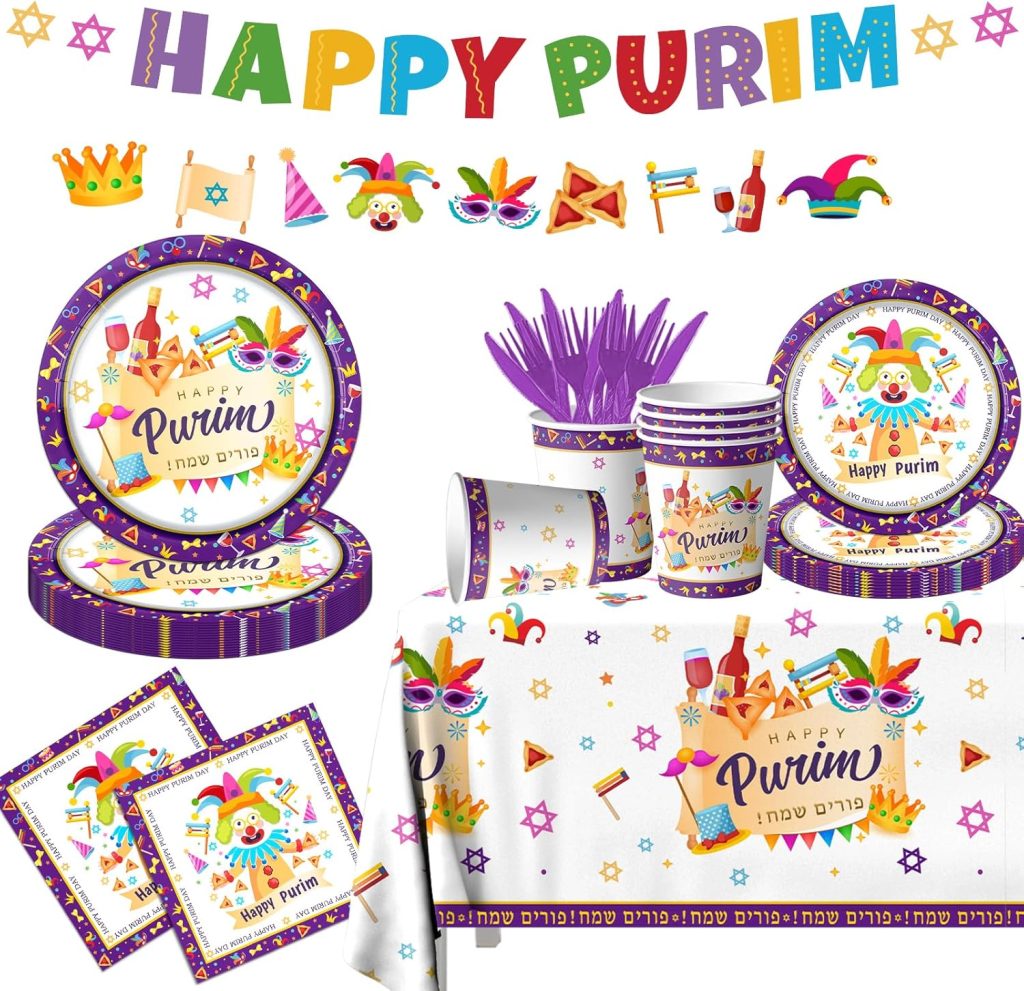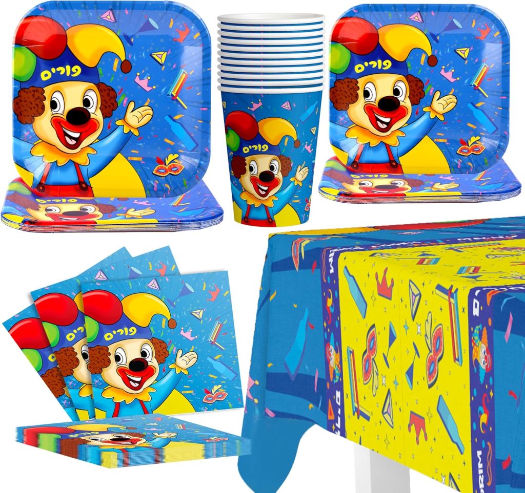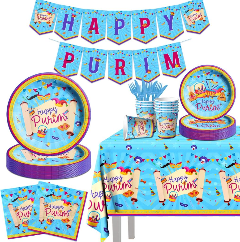 Purim Plates – Purim Party Tableware Set – Purim Party Supplies – Happy Purim Decorations for Home – Purim Party Goods – Serves 8 – Plates, Cups, Napkins, and Tablecloth