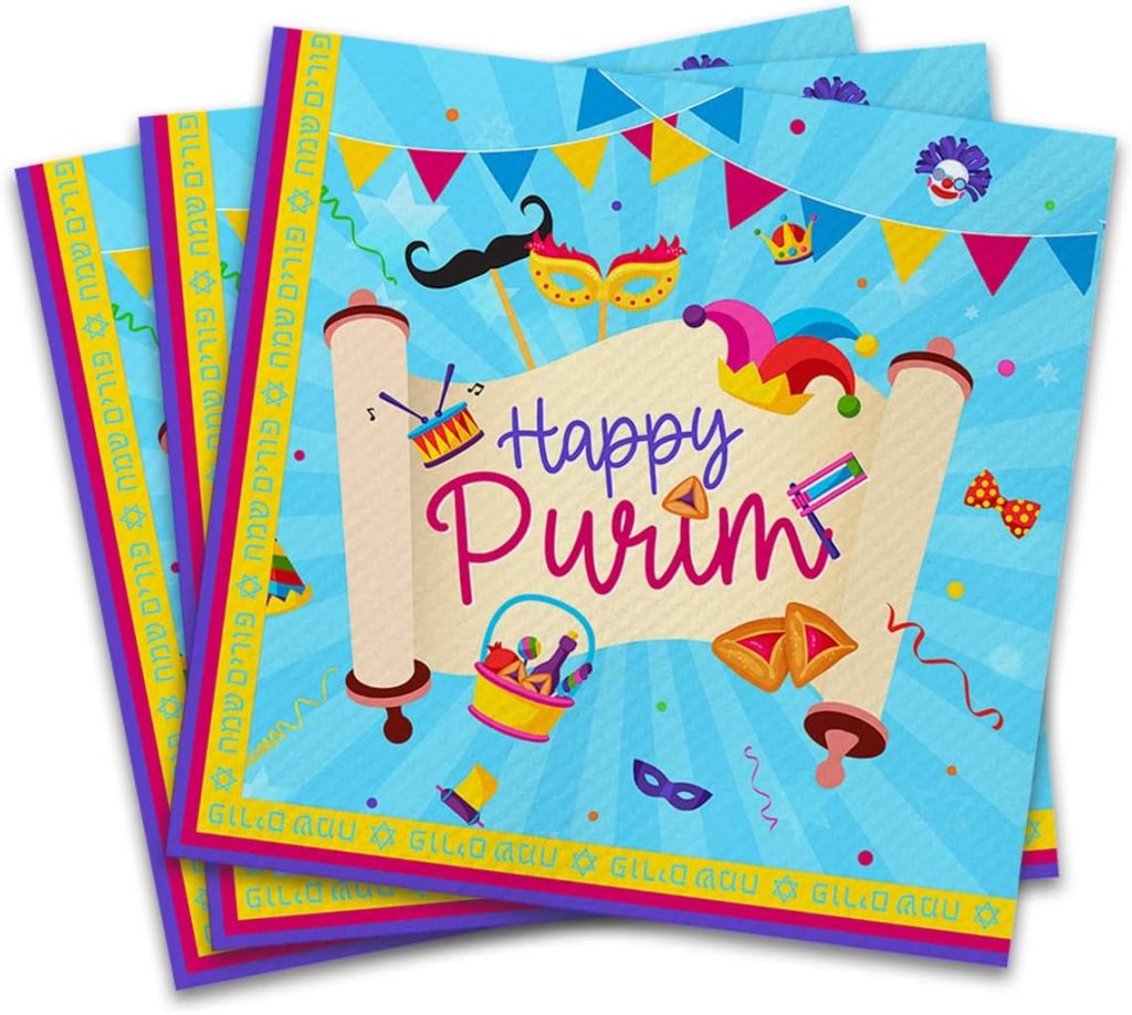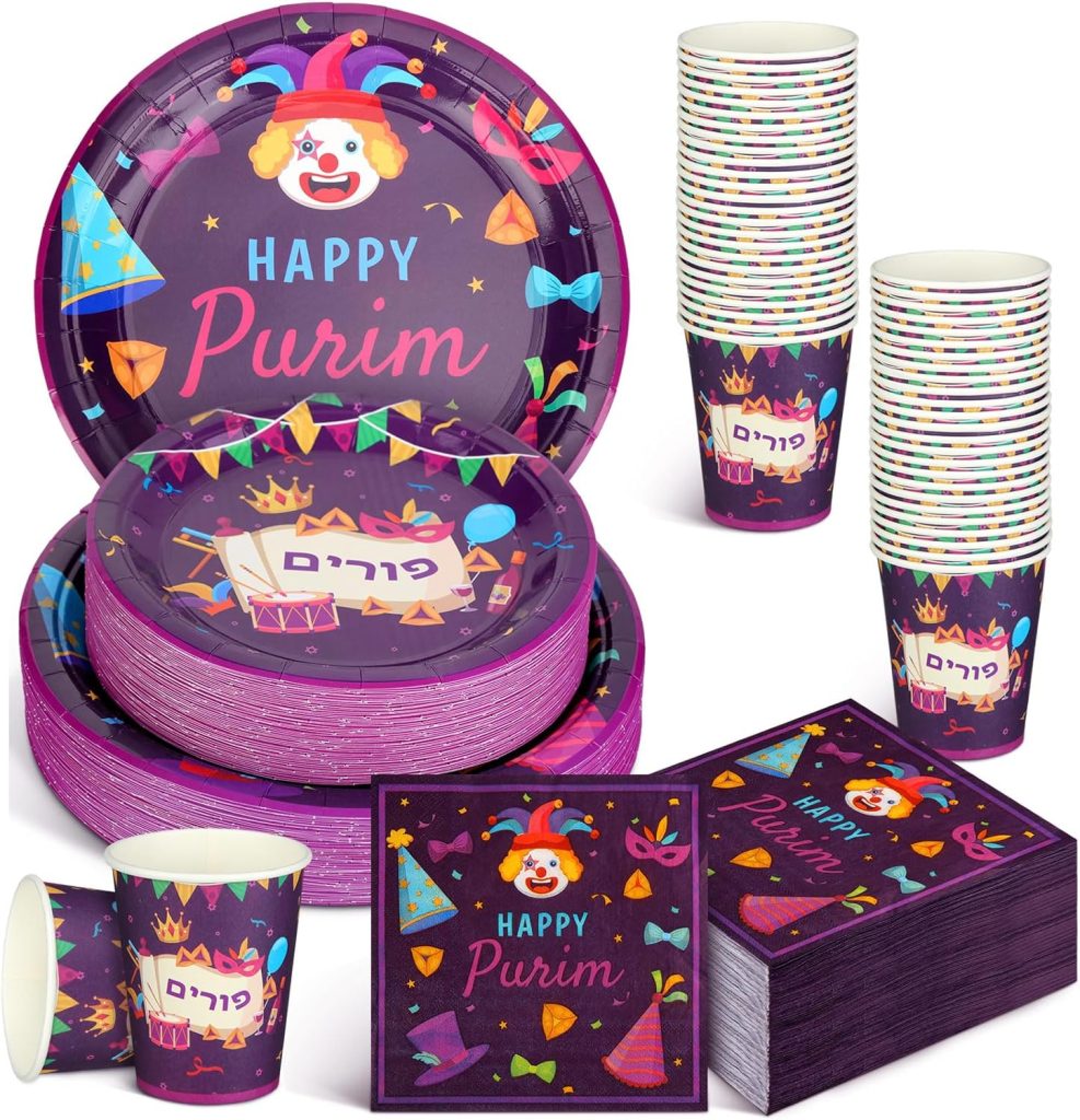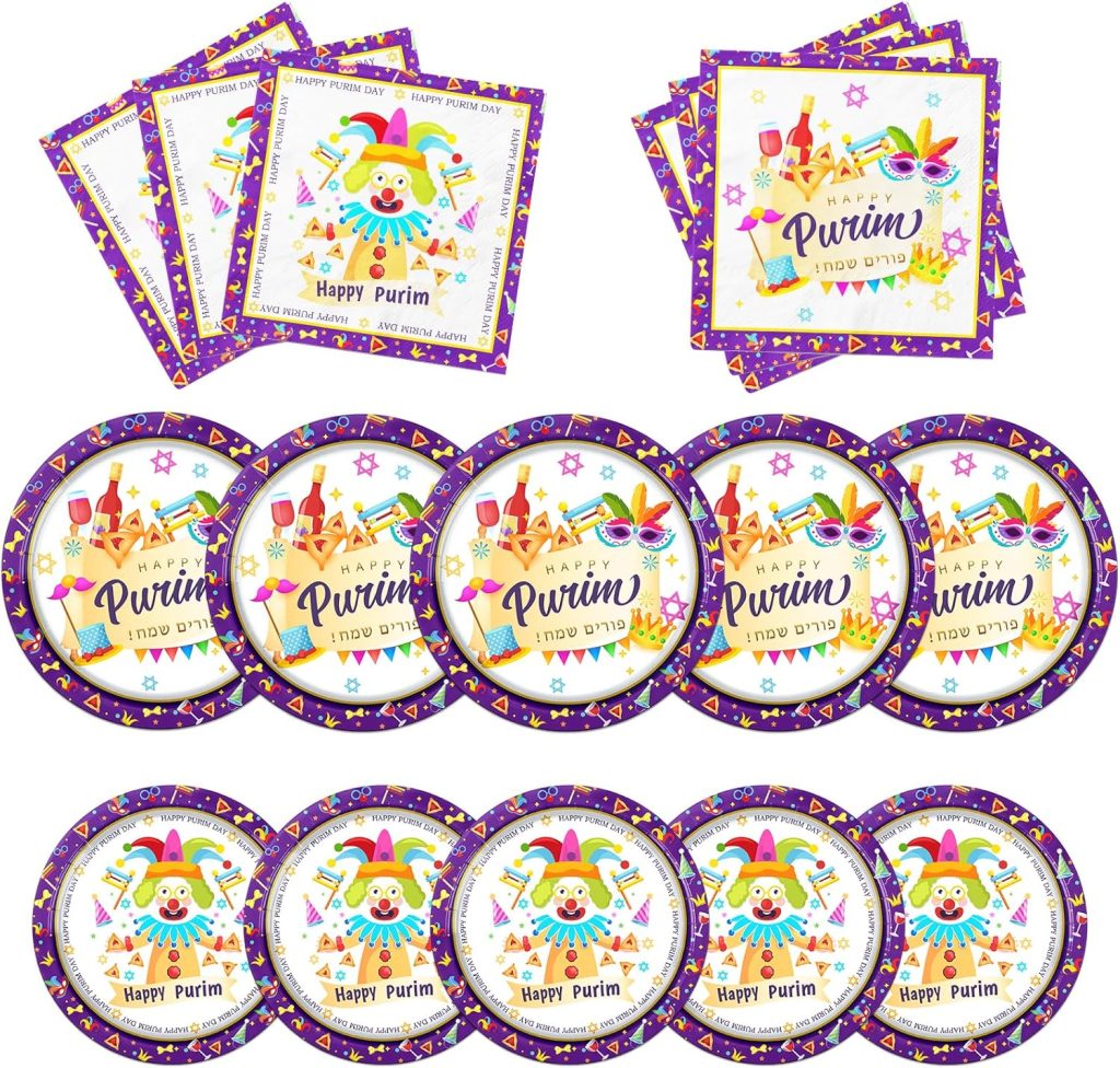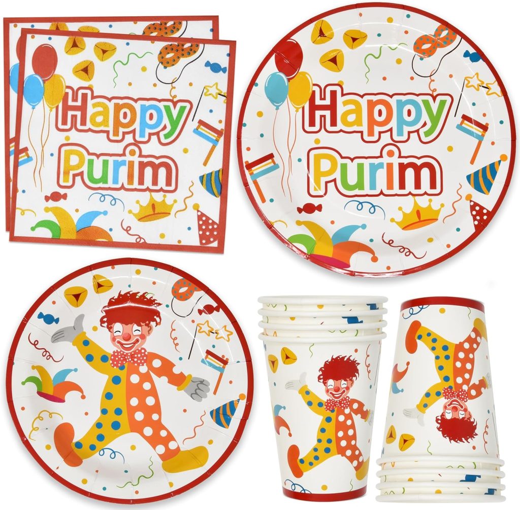 Purim Plates – Purim Party Tableware Set – Purim Party Supplies – Happy Purim Decorations for Home – Purim Party Goods – Serves 8 – Plates, Cups, Napkins, and Tablecloth