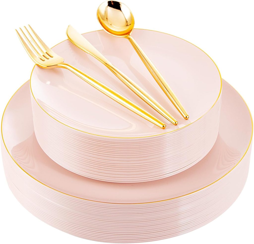 I00000 150Pcs Gold Plastic Plates for 30 Guests,Pink Disposable Plates for Party,Gold Plastic Dinnerware Set Include 30 Dinner Plates, 30 Dessert Plates,30 Gold plastic silverware set for christmas