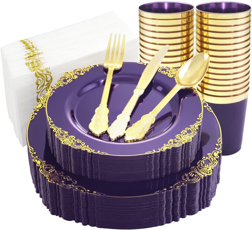 Nervure 175PCS Clear Purple Gold Plastic Plates for 25 Guests Include 25Dinner & 25Dessert Plates, 25Cups, 25Forks, 25Knives, 25Spoons, 25Napkins for Wedding&Party