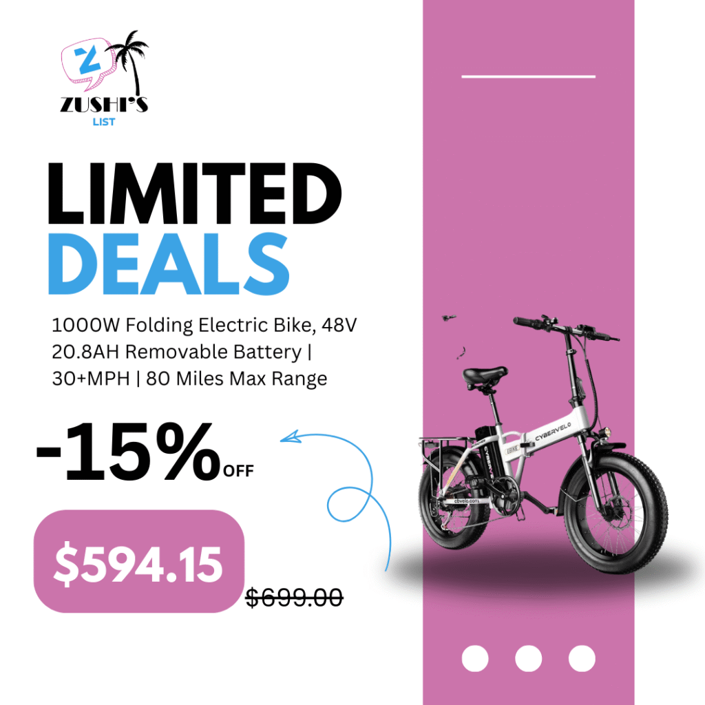 1000W Folding Electric Bike, 48V 20.8AH Removable Battery | 30+MPH | 80 Miles Max Range | 20″ Fat Tire | for Adults | for Commute