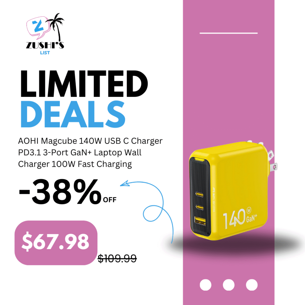 AOHI Magcube 140W USB C Charger PD3.1 3-Port GaN+ Laptop Wall Charger 100W Fast Charging Power Adapter Foldable Plug for MacBook Pro 16”, Dell XPS, iPad Pro, Galaxy, iPhone 15 Pro, Chromebook, Yellow