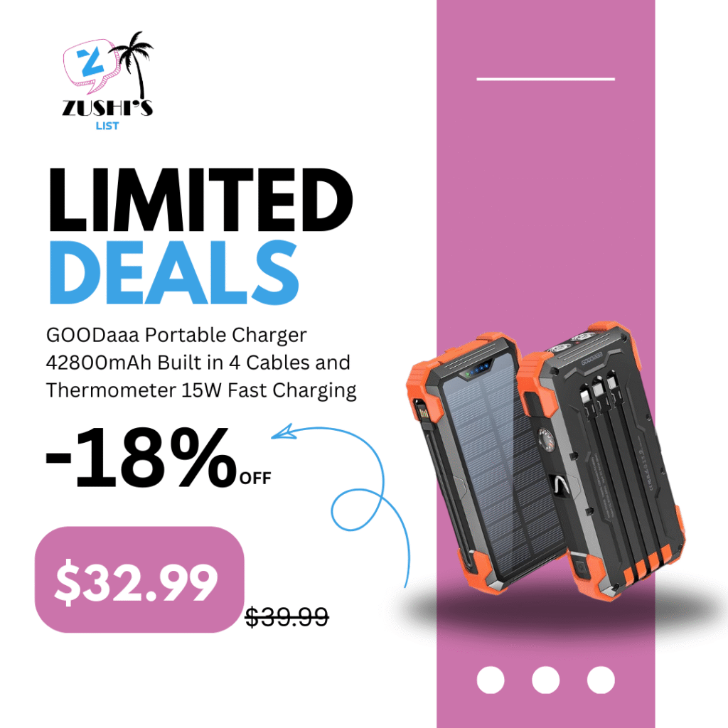 GOODaaa Portable Charger 42800mAh Built in 4 Cables and Thermometer 15W Fast Charging Power Bank Five Outputs Three Inputs Solar Charger Power Bank, SOS/Strobe/Strong Flashlights, Carabiner