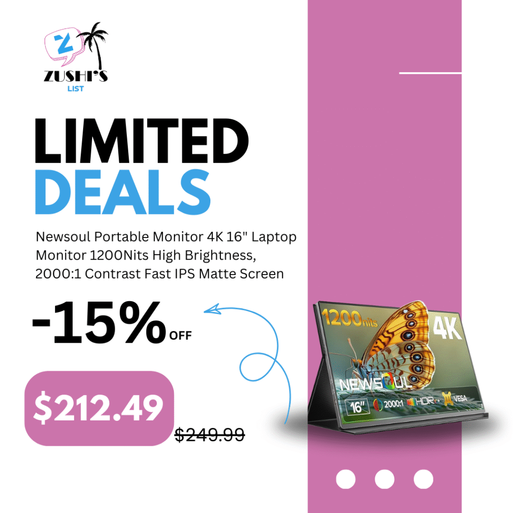 Newsoul Portable Monitor 4K 16″ Laptop Monitor 1200Nits High Brightness, 2000:1 Contrast Fast IPS Matte Screen with VESA & Protective Case, Built-in USB-C HDMI Portable Screen for Phone Game Console