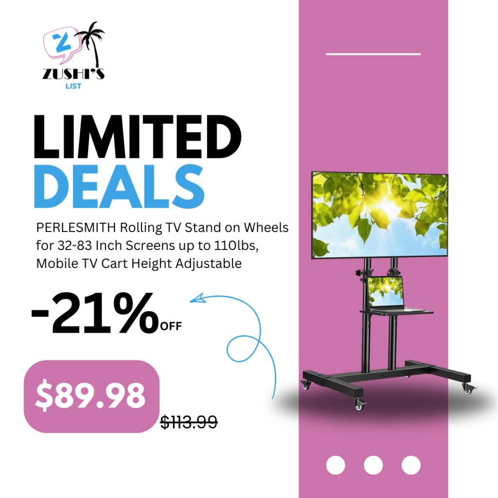 PERLESMITH Rolling TV Stand on Wheels for 32-83 Inch Screens up to 110lbs, Mobile TV Cart Height Adjustable Portable Outdoor TV Stand Tilt Rolling TV Cart with Shelf Max VESA 600x400mm PSTVMC03