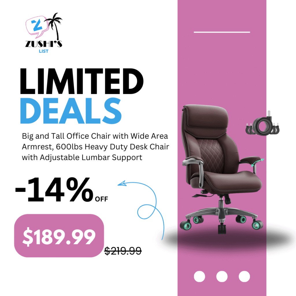 Big and Tall Office Chair with Wide Area Armrest, 600lbs Heavy Duty Desk Chair with Adjustable Lumbar Support, PU Leather High Back Ergonomic Executive Computer Chair with 3” Silent Casters