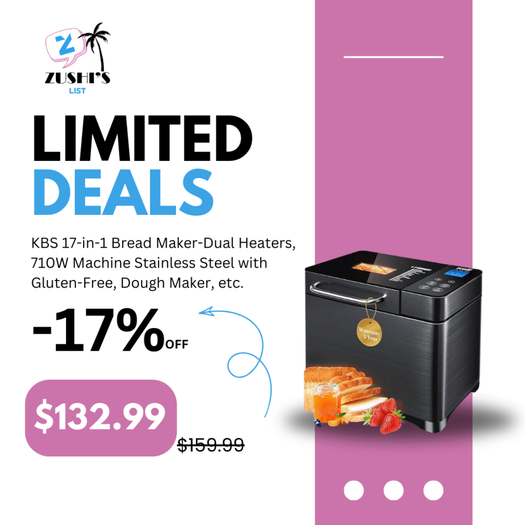 KBS 17-in-1 Bread Maker-Dual Heaters, 710W Machine Stainless Steel with Gluten-Free, Dough Maker,Jam,Yogurt PROG, Auto Nut Dispenser,Ceramic Pan& Touch Panel, 3 Loaf Sizes 3 Crust Colors,Recipes