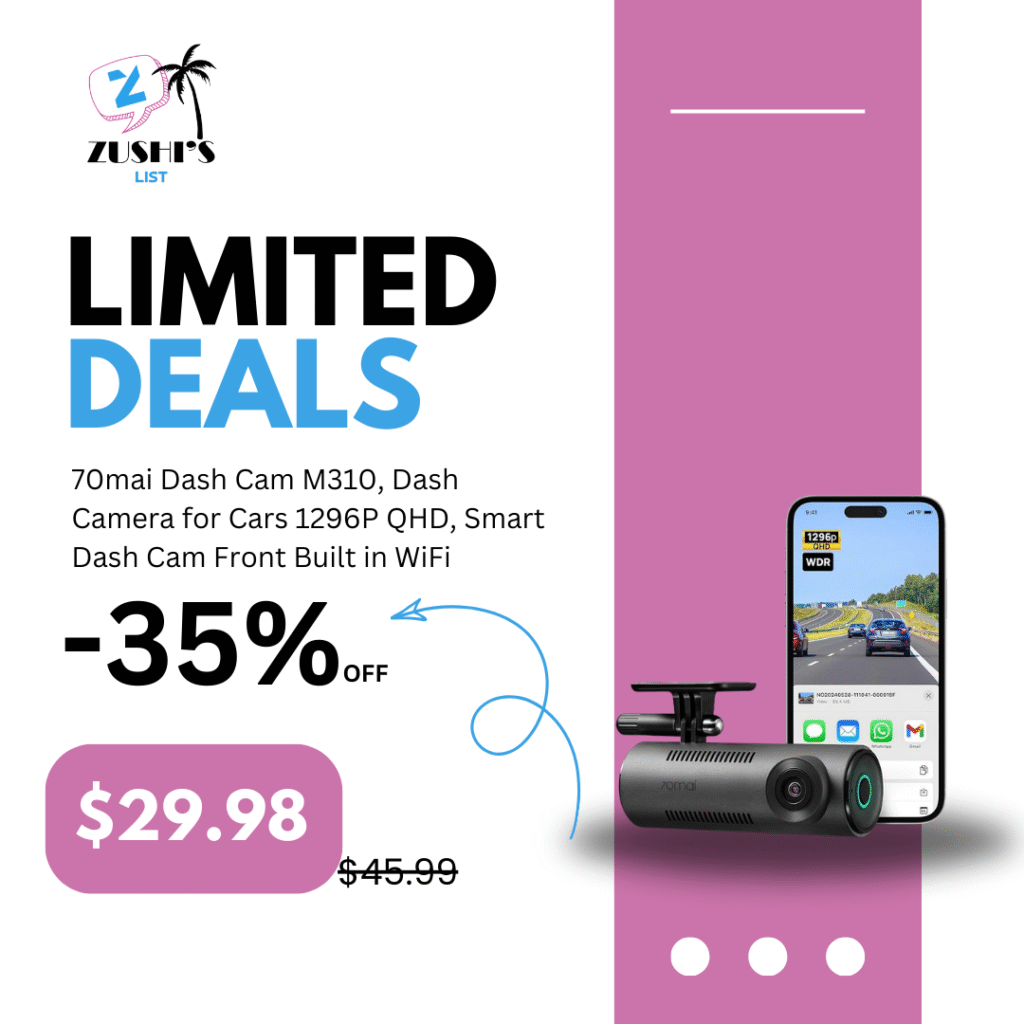 70mai Dash Cam M310, Dash Camera for Cars 1296P QHD, Smart Dash Cam Front Built in WiFi, 130° Wide-Angle FOV, WDR, Night Vision, iOS/Android Mobile App, Loop Recording, Parking Monitor, Time-Lapse