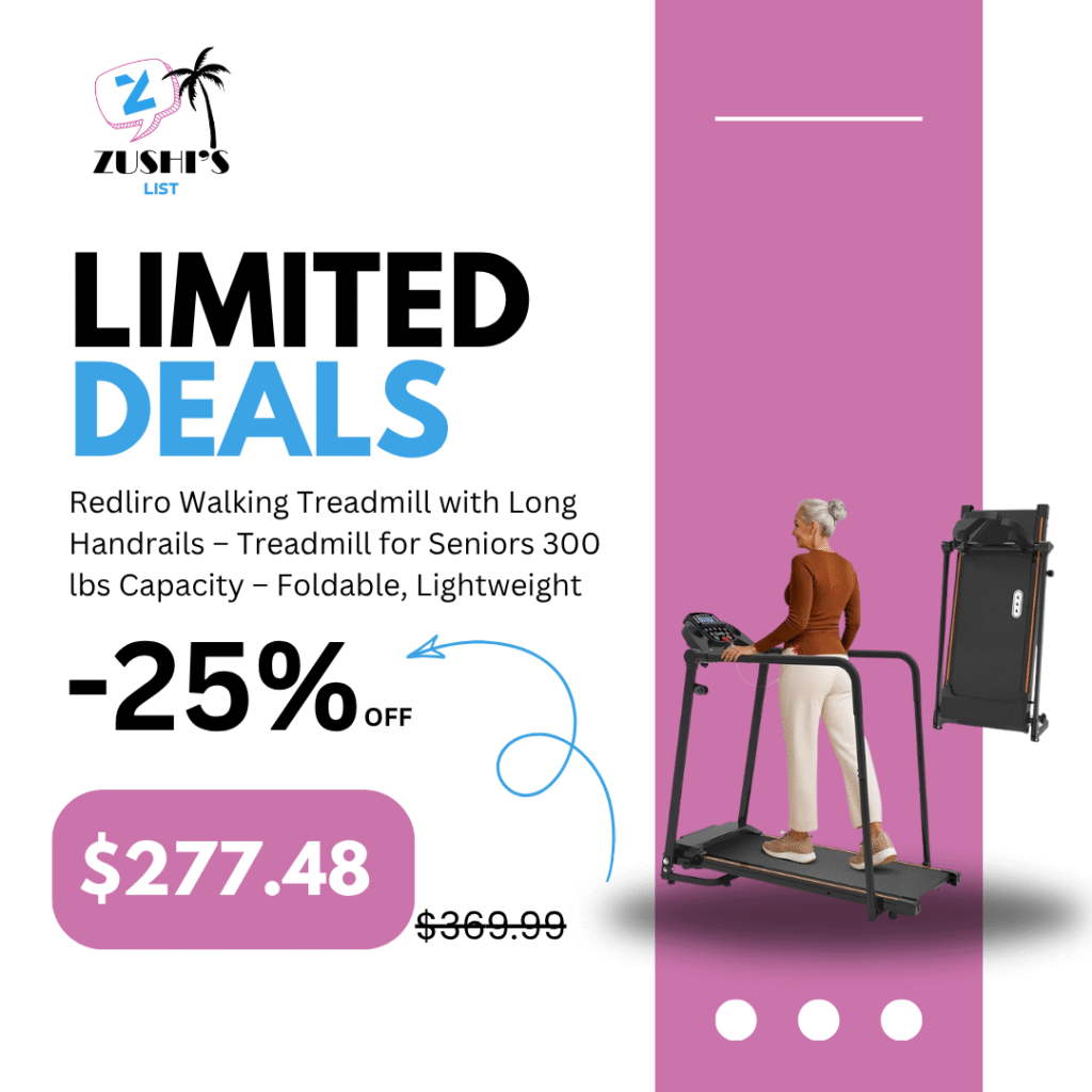 Redliro Walking Treadmill with Long Handrails – Treadmill for Seniors 300 lbs Capacity – Foldable, Lightweight with Wheels, Cup & Phone Holder – Recovery Machine for Home or Apartment