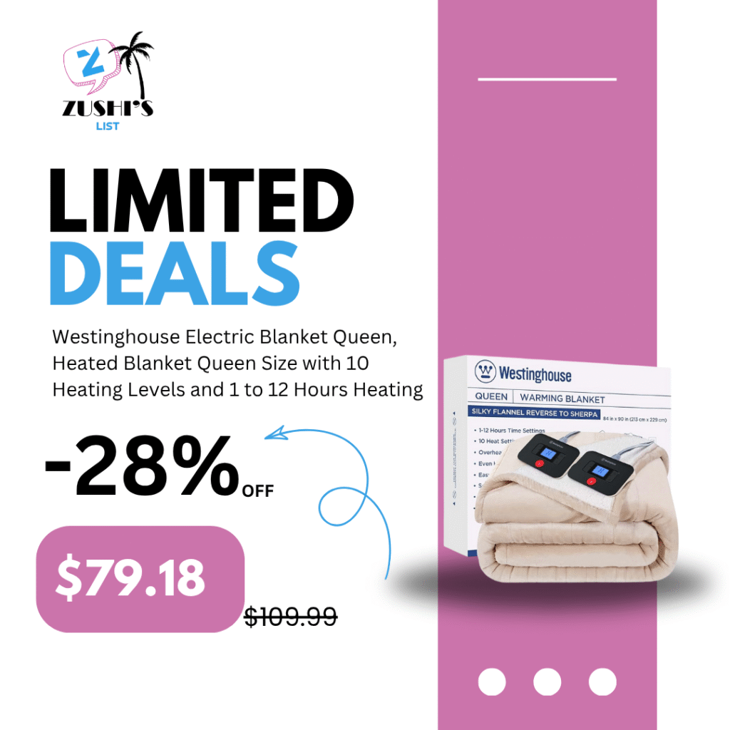 Westinghouse Electric Blanket Queen, Heated Blanket Queen Size with 10 Heating Levels and 1 to 12 Hours Heating Time Settings, Flannel to Sherpa Reversible, Machine Washable (84″ x 90″, Beige)