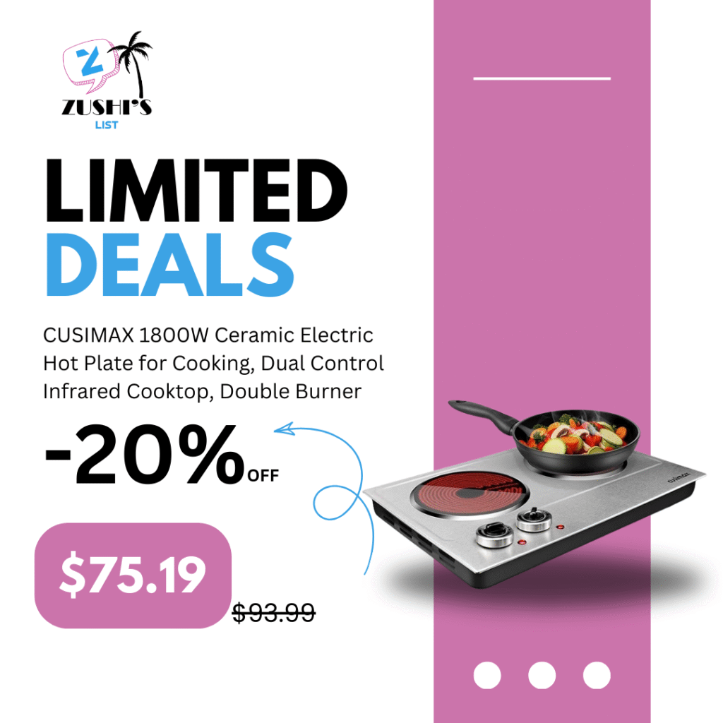 CUSIMAX 1800W Ceramic Electric Hot Plate for Cooking, Dual Control Infrared Cooktop, Double Burner, Portable Countertop Burner, Glass Plate Electric Cooktop, Silver, Stainless Steel-Upgraded Version