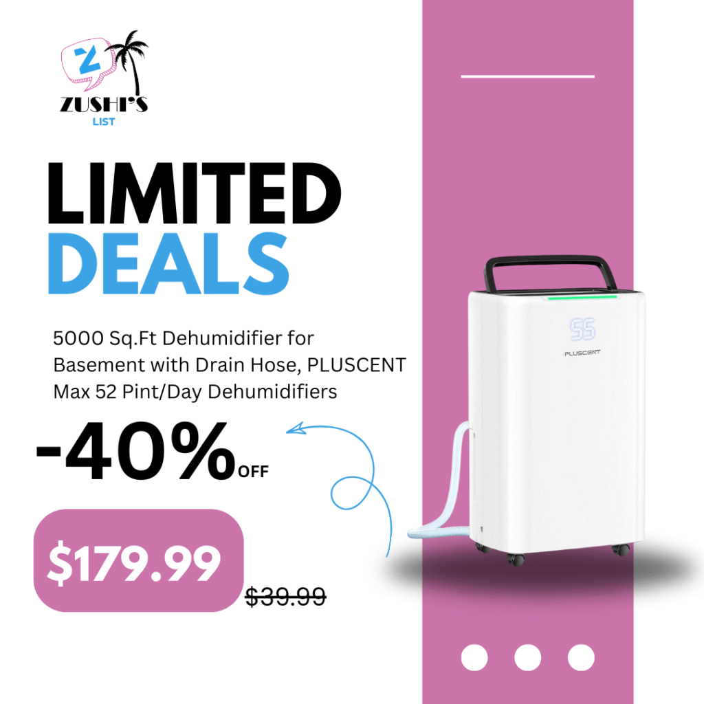 5000 Sq.Ft Dehumidifier for Basement with Drain Hose, PLUSCENT Max 52 Pint/Day Dehumidifiers for Home Bedroom Bathroom, 4 Modes, Smart Humidity Control, Auto Restart, Auto Defrost, 24H Timer