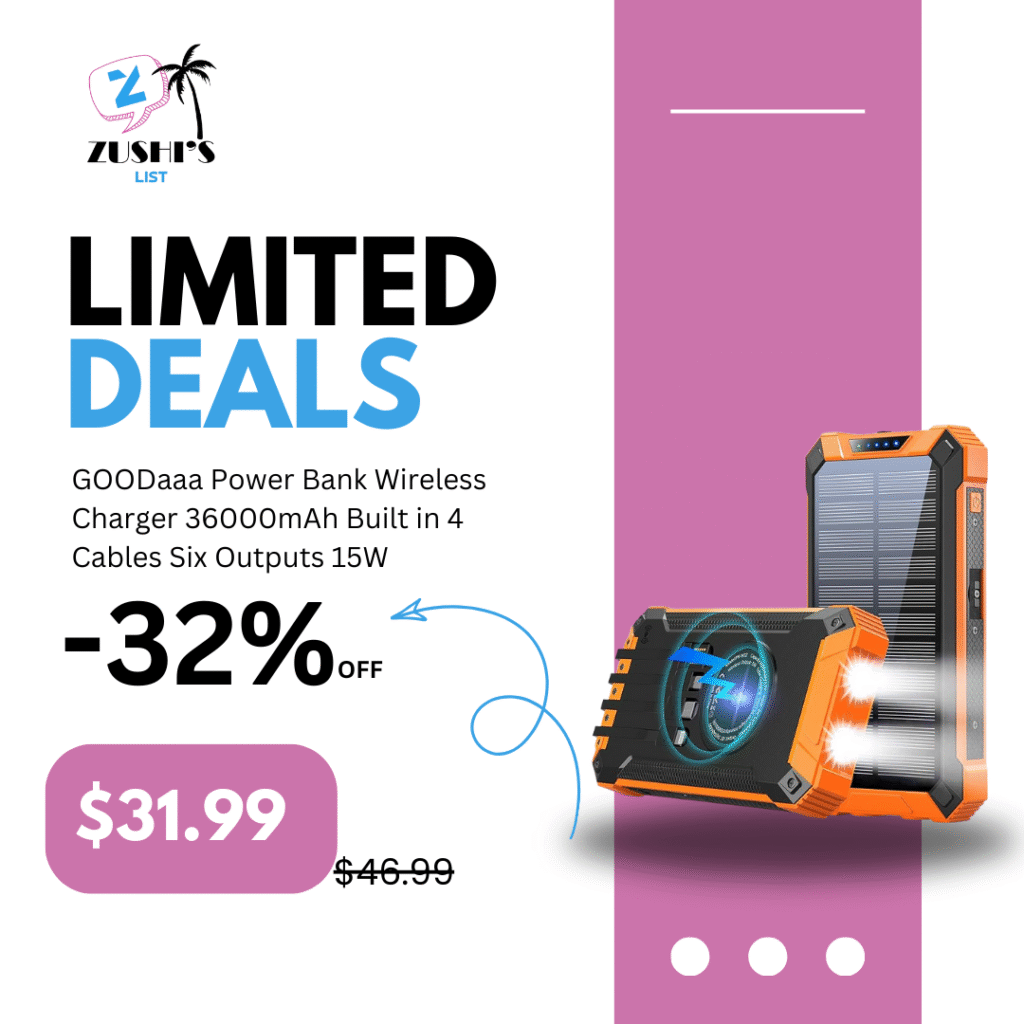 GOODaaa Power Bank Wireless Charger 36000mAh Built in 4 Cables Six Outputs 15W Fast Charging Power Bank for All Mobile Devices Three Inputs Solar Portable Charger with Dual Flashlights, Carabiner