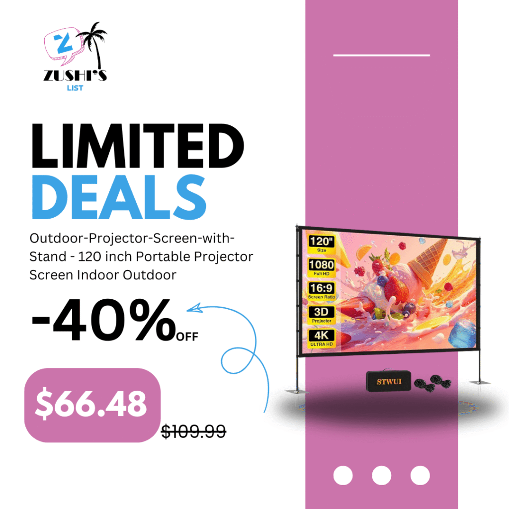 Outdoor-Projector-Screen-with-Stand – 120 inch Portable Projector Screen Indoor Outdoor Projector Screens 16:9 4K HD Lightweight Movie Screen with Carry Bag for Backyard Movie Night
