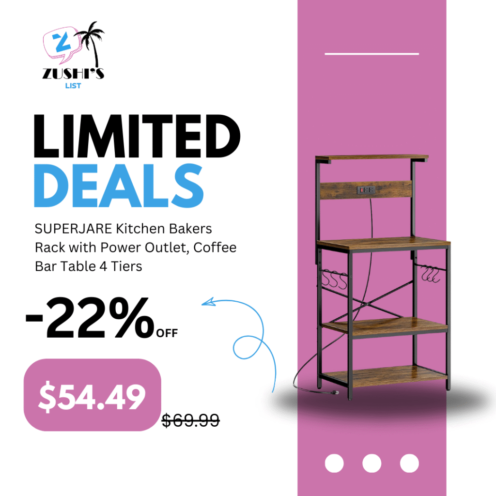SUPERJARE Kitchen Bakers Rack with Power Outlet, Coffee Bar Table 4 Tiers, Kitchen Microwave Stand with 6 S-shaped Hooks, Storage Shelf Rack for Spices, Pots and Pans – Rustic Brown