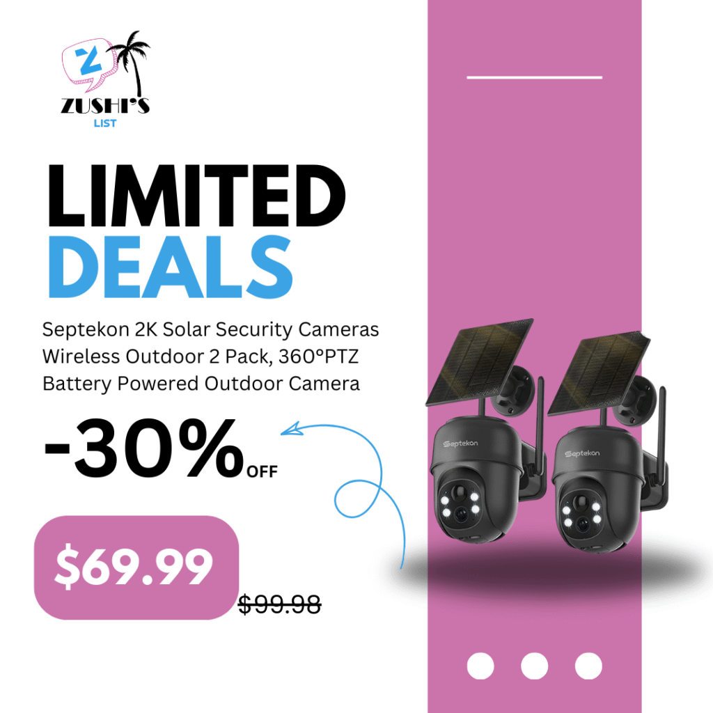 Septekon 2K Solar Security Cameras Wireless Outdoor 2 Pack, 360°PTZ Battery Powered Outdoor Camera, 2.4G WiFi Camera with Spotlight Color Night Vision, Motion Sensor Alarm, IP66, Black
