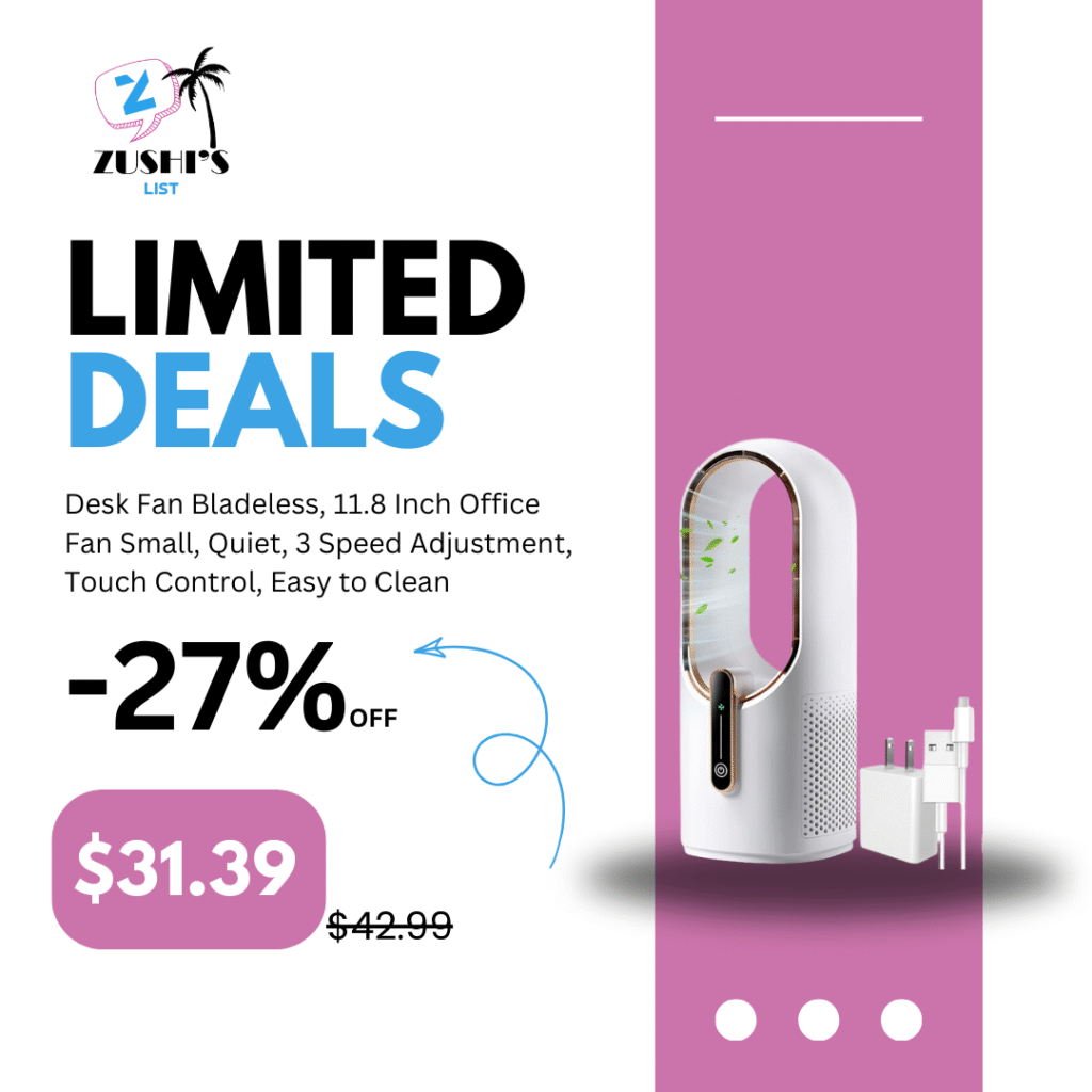 Desk Fan Bladeless, 11.8 Inch Office Fan Small, Quiet, 3 Speed Adjustment, Touch Control, Easy to Clean, Desk Fans Small Quiet, Ideal for Office, Living Room, Bedroom
