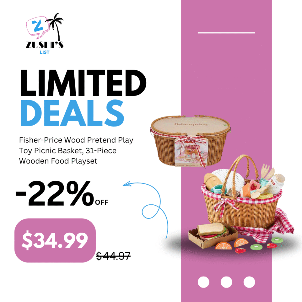 Fisher-Price Wood Pretend Play Toy Picnic Basket, 31-Piece Wooden Food Playset for Preschool Kids Ages 3+ Years