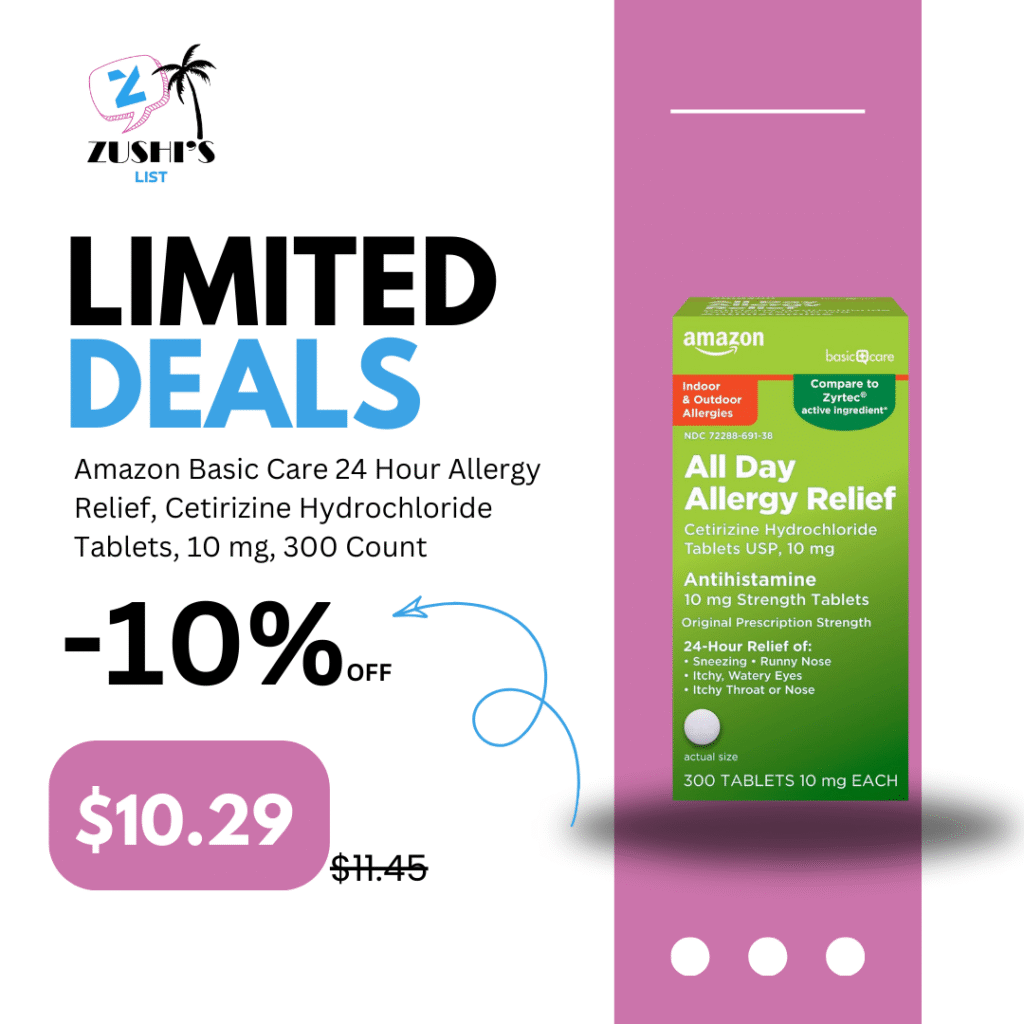 Amazon Basic Care 24 Hour Allergy Relief, Cetirizine Hydrochloride Tablets, 10 mg, 300 Count (Packaging may vary)