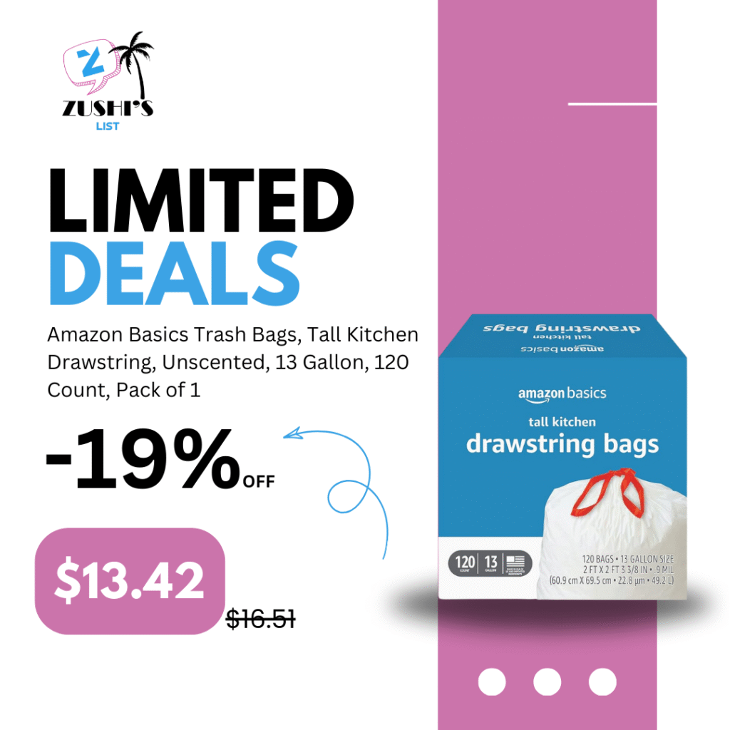 Amazon Basics Trash Bags, Tall Kitchen Drawstring, Unscented, 13 Gallon, 120 Count, Pack of 1