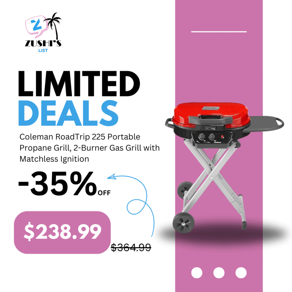 Coleman RoadTrip 225 Portable Propane Grill, 2-Burner Gas Grill with Matchless Ignition & Adjustable Temperature Control, 11,000 BTUs of Power for Grilling, Tailgating, Camping, BBQ, & More