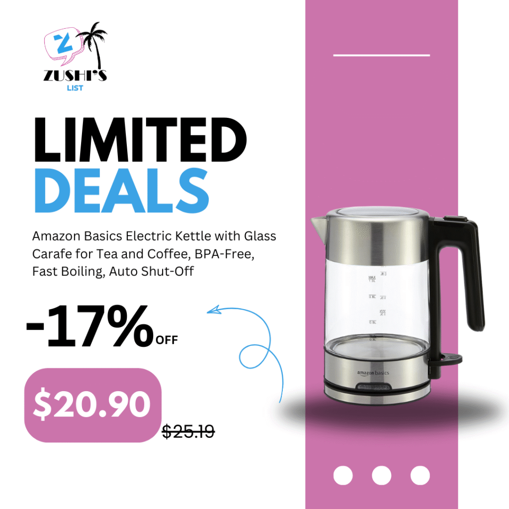 Amazon Basics Electric Kettle with Glass Carafe for Tea and Coffee, BPA-Free, Fast Boiling, Auto Shut-Off, 1.1 Quarts, 1500W, Glass and Steel