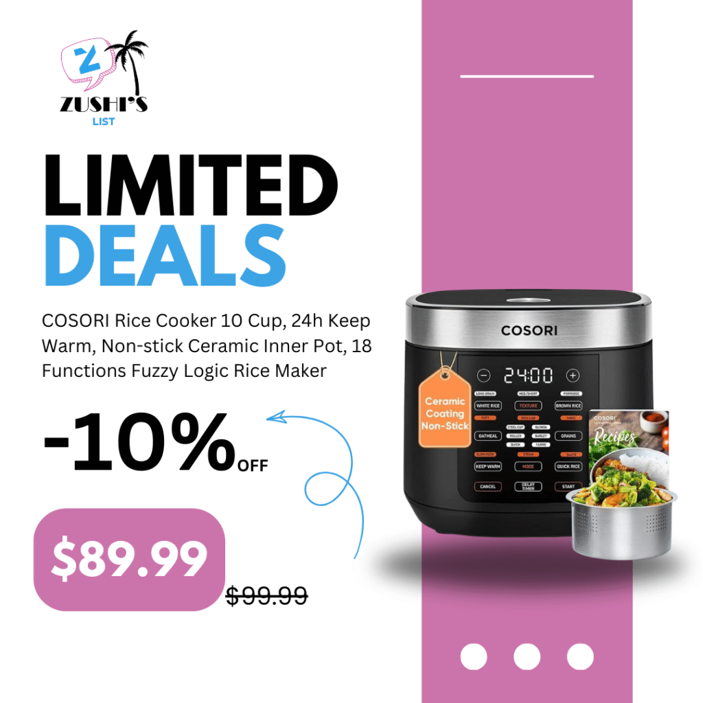 COSORI Rice Cooker 10 Cup, 24h Keep Warm, Non-stick Ceramic Inner Pot, 18 Functions Fuzzy Logic Rice Maker with Stainless Steel Steamer Basket, Sauté, Slow Cooker, Black