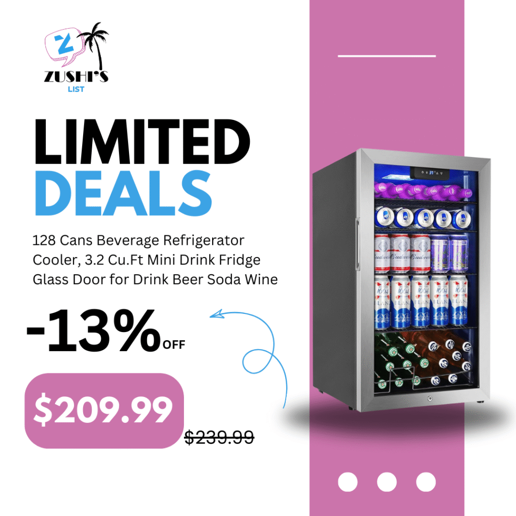 128 Cans Beverage Refrigerator Cooler, 3.2 Cu.Ft Mini Drink Fridge Glass Door for Drink Beer Soda Wine, Beer Fridge with 4 Removable Shelves for Kitchen Bedroom, Office Bar Gaming Room,Stainless Steel
