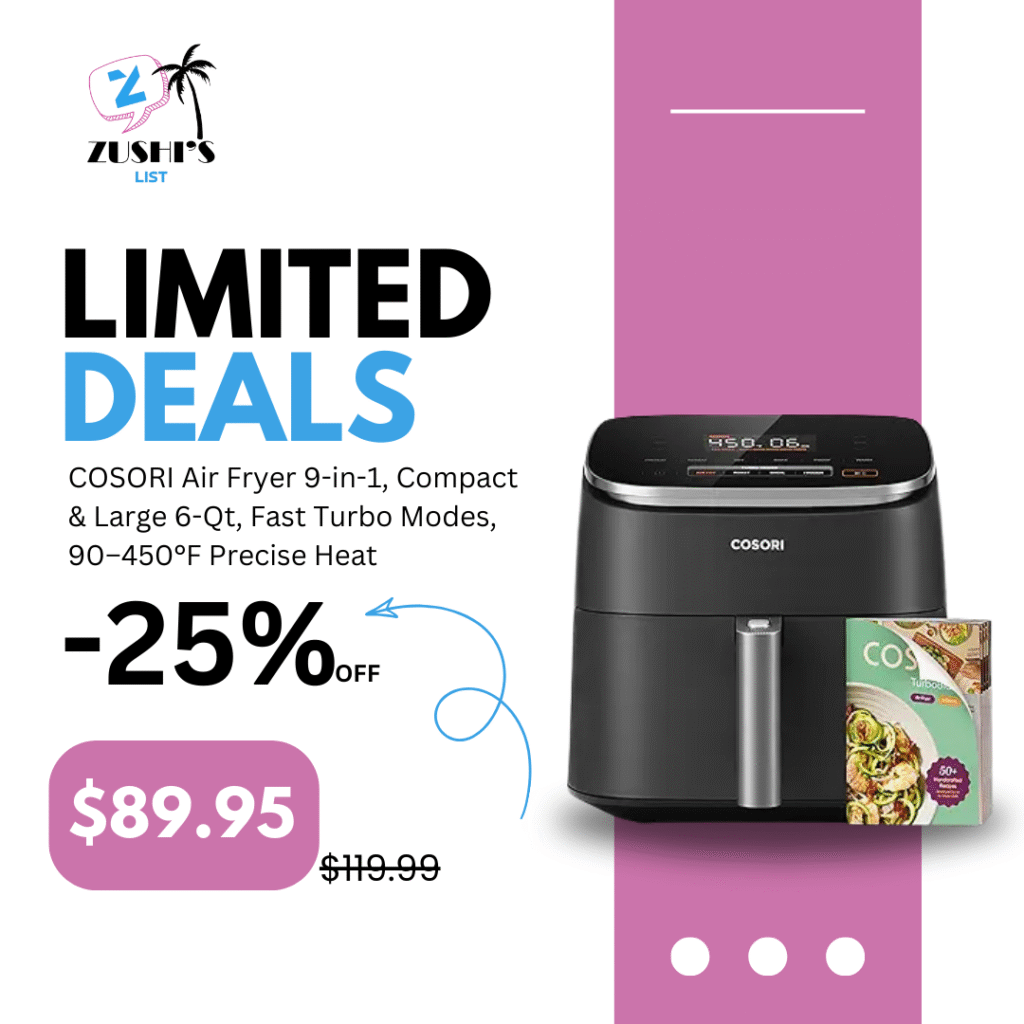 COSORI Air Fryer 9-in-1, Compact & Large 6-Qt, Fast Turbo Modes, 90–450°F Precise Heat for Even Results, Up to 95% Less Oil*, Roast, Bake, Dry, Reheat, Frozen, Broil, Proof, 120V, TurboBlaze, Ceramic