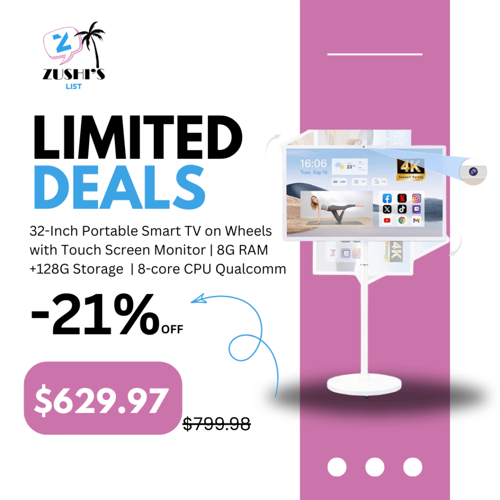 32-Inch Portable Smart TV on Wheels with Touch Screen Monitor | 8G RAM +128G Storage | 8-core CPU Qualcomm | Built-in 8-10H Battery | 8MP Webcam | Android 13 OS | Full Swivel Rotation | Remote Control