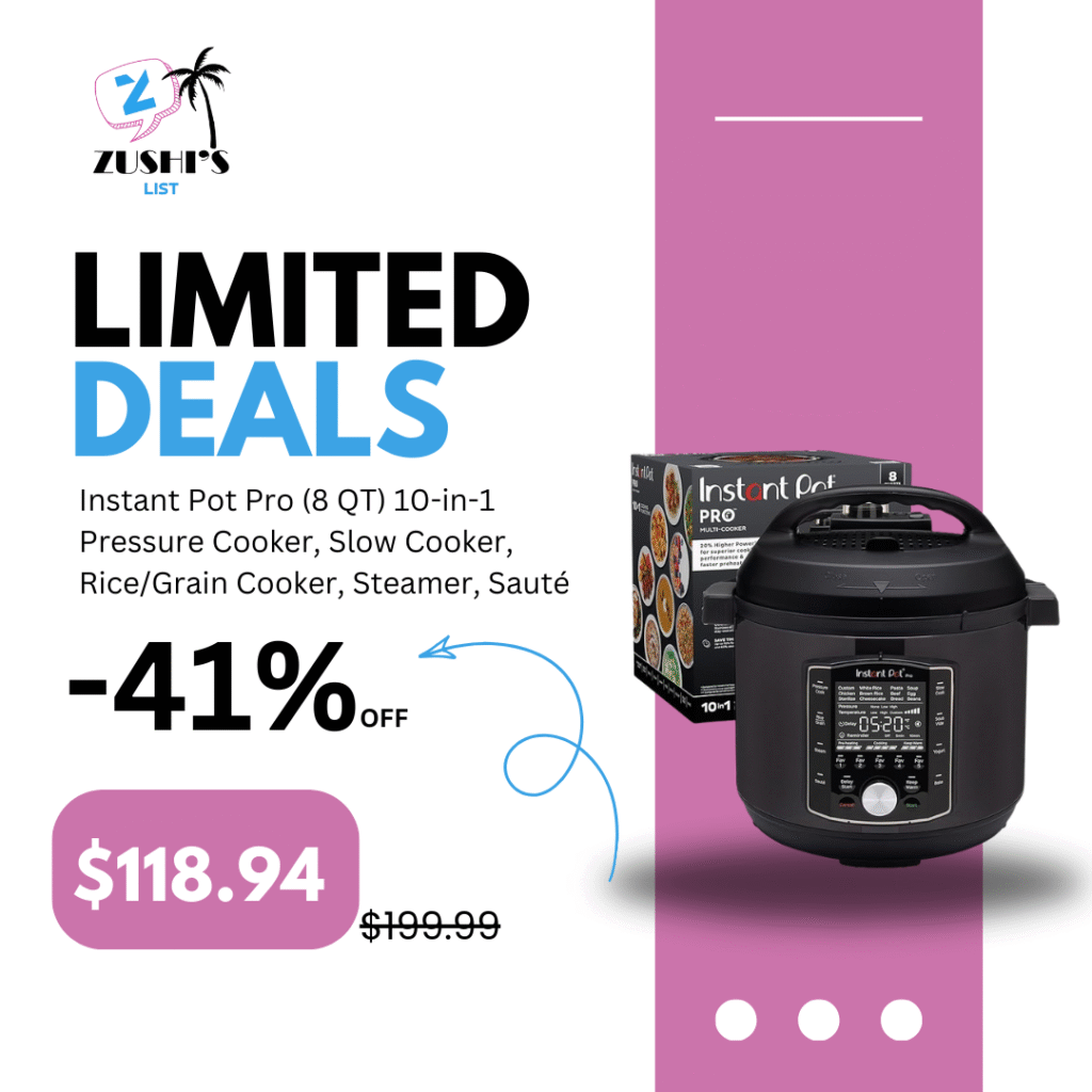 Instant Pot Pro (8 QT) 10-in-1 Pressure Cooker, Slow Cooker, Rice/Grain Cooker, Steamer, Sauté, Sous Vide, Yogurt Maker, Sterilizer, and Warmer, Includes App With Over 800 Recipes, Black