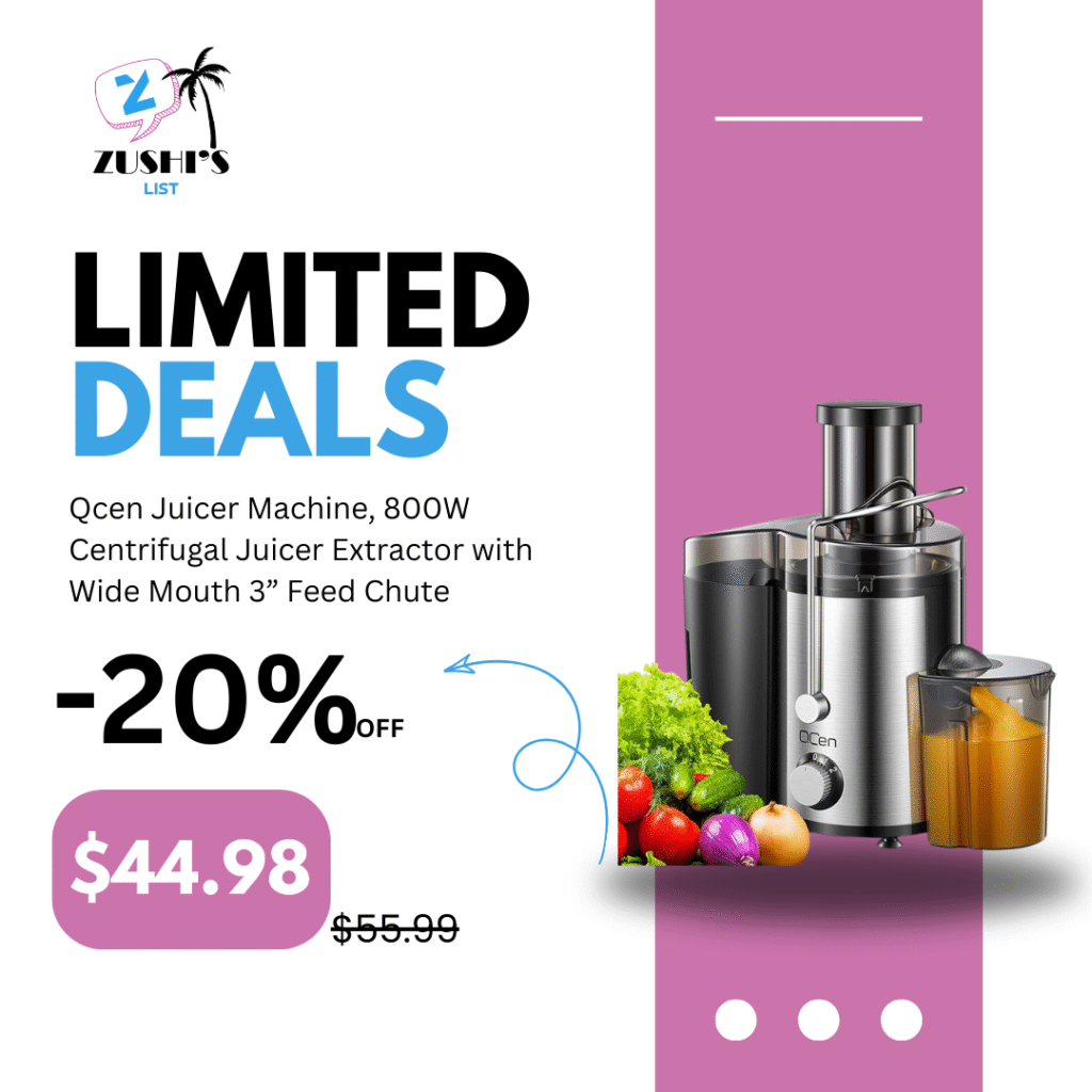 Qcen Juicer Machine, 800W Centrifugal Juicer Extractor with Wide Mouth 3” Feed Chute for Fruit Vegetable, Easy to Clean, Stainless Steel, BPA-free (Black)