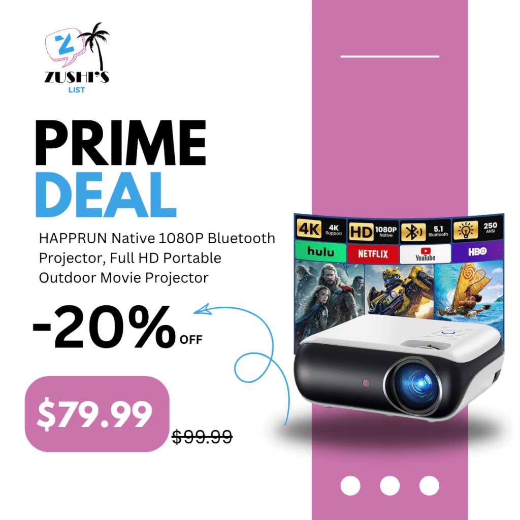 HAPPRUN Native 1080P Bluetooth Projector, Full HD Portable Outdoor Movie Projector with Built-in Speaker, Compatible with Smartphone, HDMI, USB, AV, Fire Stick, PS5 for Home, Bedroom, Outdoor Use