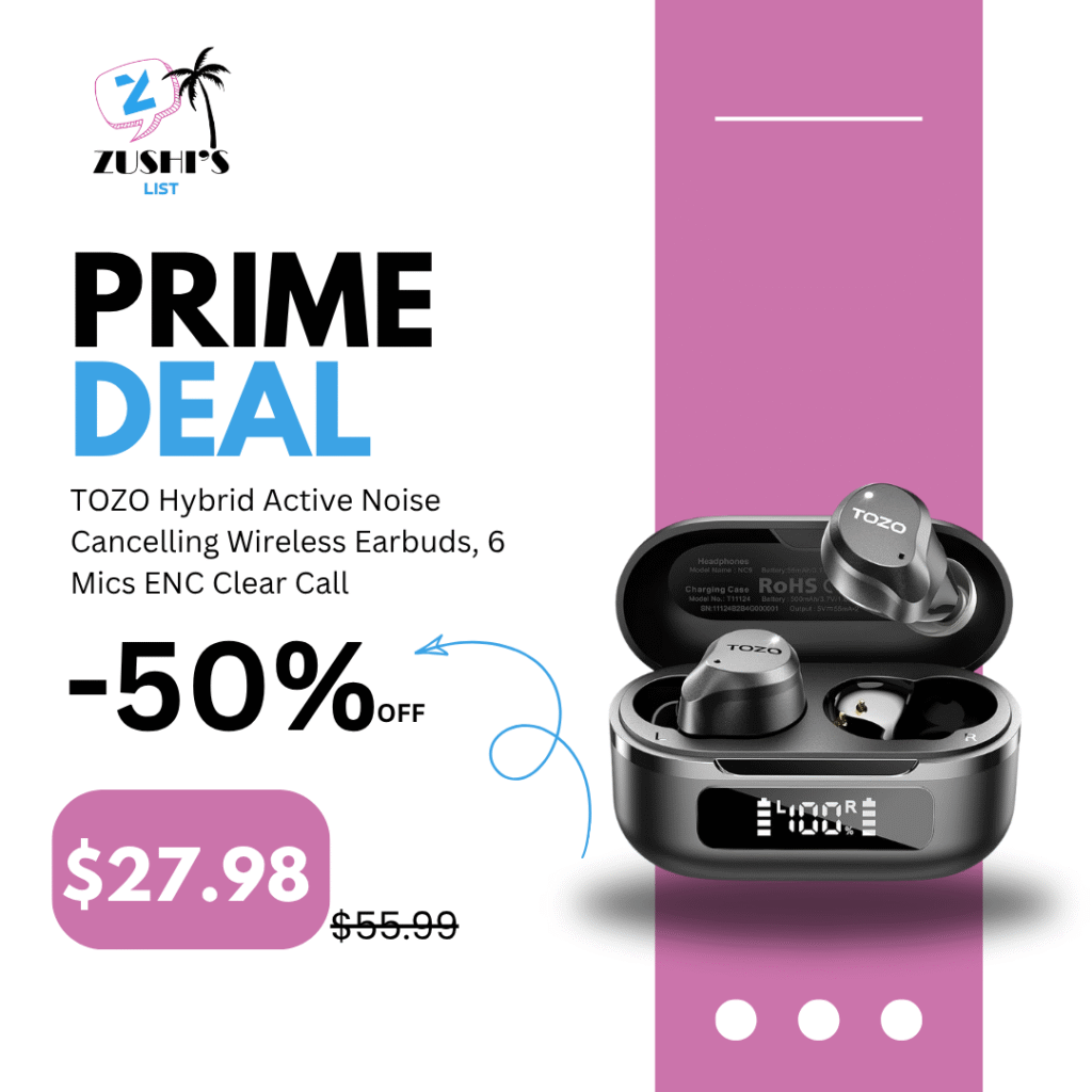 TOZO Hybrid Active Noise Cancelling Wireless Earbuds, 6 Mics ENC Clear Call, IPX8 Waterproof, in Ear Bluetooth 5.3 Headphones Stereo Bass Ear Buds 59H Playtime with LED Display 32 EQs via APP
