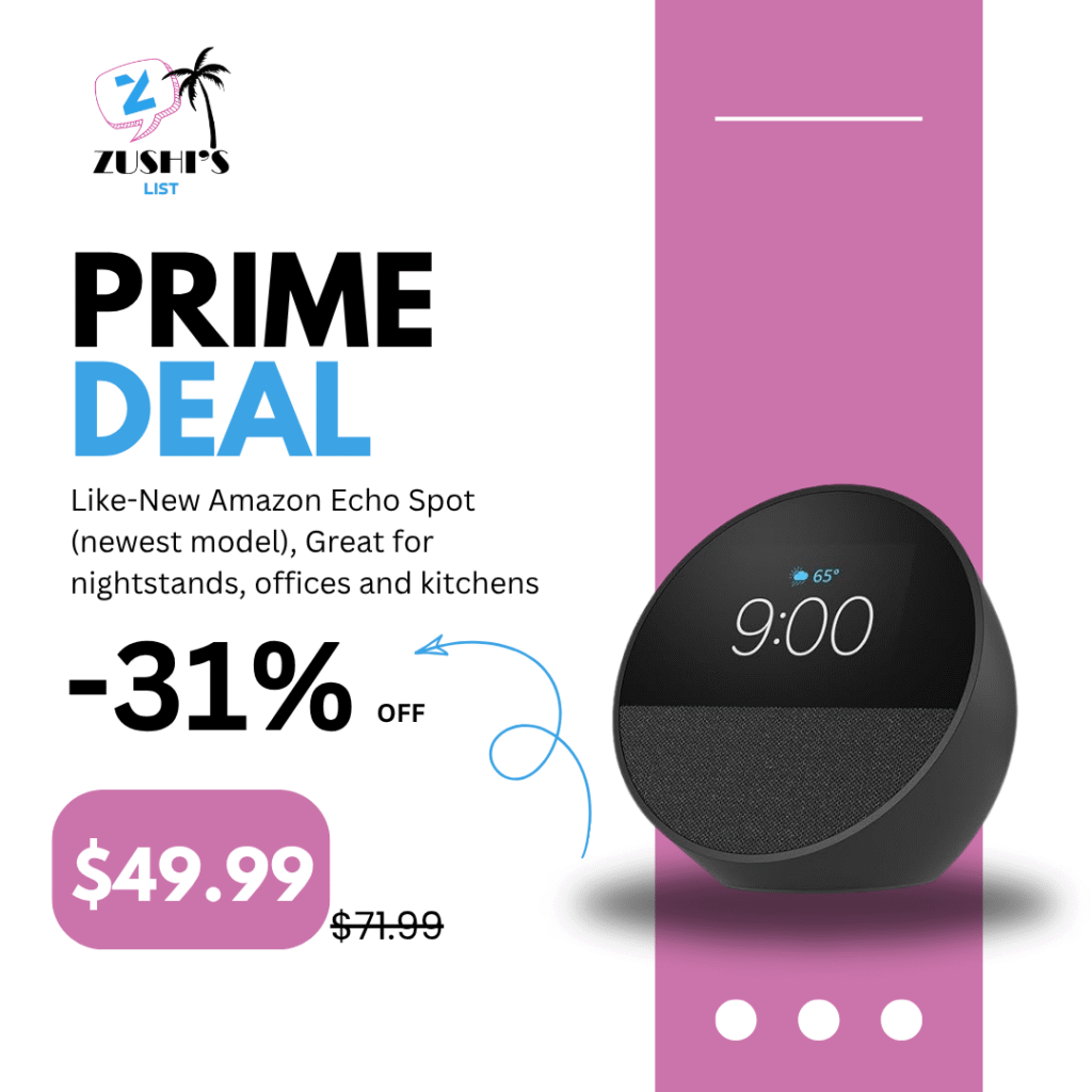 Like-New Amazon Echo Spot (newest model), Great for nightstands, offices and kitchens, Smart alarm clock with Alexa, Black