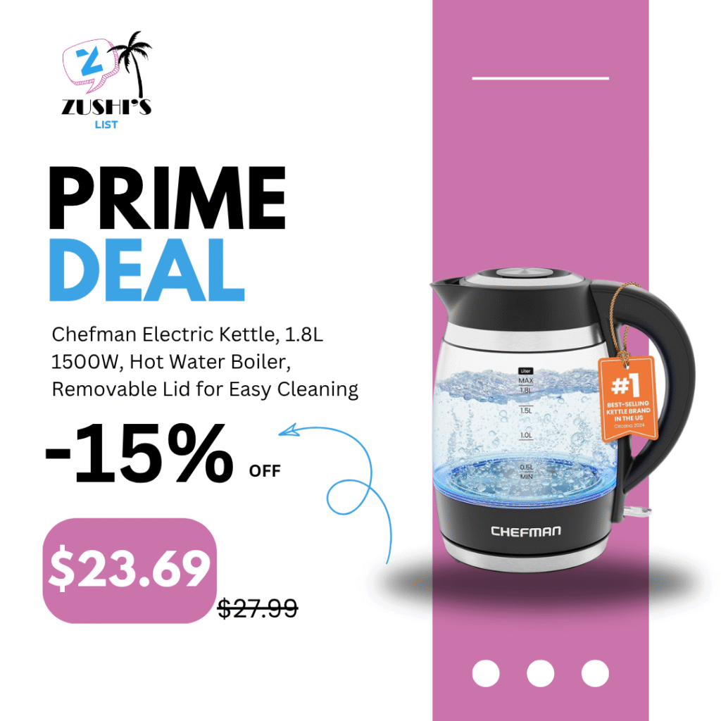 Chefman Electric Kettle, 1.8L 1500W, Hot Water Boiler, Removable Lid for Easy Cleaning, Auto Shut Off, Boil-Dry Protection, Stainless Steel Filter, BPA Free, Borosilicate Glass Electric Tea Kettle